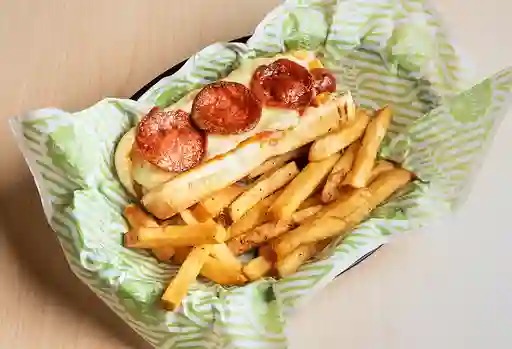 Salchicha jumbo frankfurt con queso gouda, mozarella con salsa de jitomate y peperoni