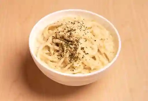 Pasta, mantequilla, tocino, 50gr de pollo y queso parmesano.