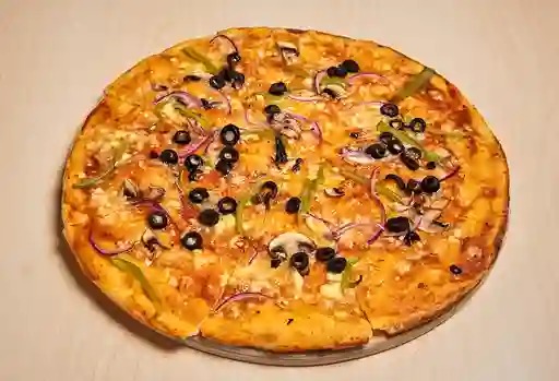 Salsa de tomate, champiñón, pimiento, aceitunas negras y cebolla