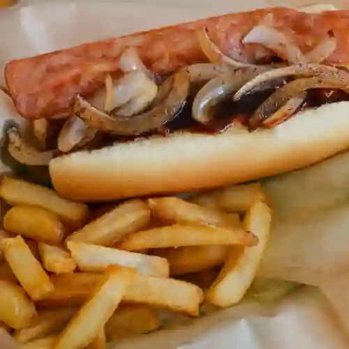 Salchicha jumbo frankfurt con tocino, aros de cebolla y salsa bbq.