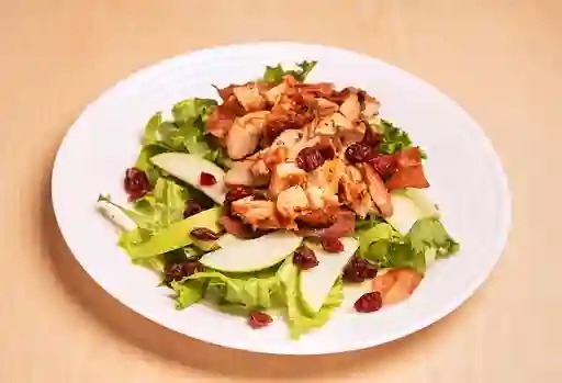 100gr de pechuga de pollo. lechuga, espinaca, arúgula, manzana verde, arándanos y tocino.