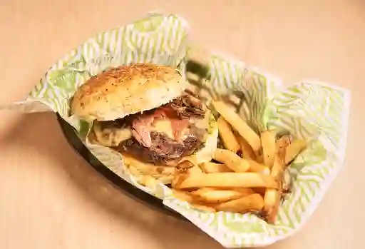 120gr de res, queso manchego, tocino, aros de cebolla, bbq, lechuga y mayonesa