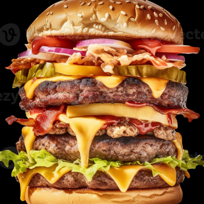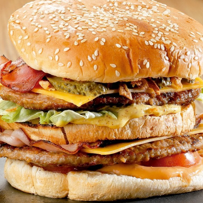 2 hamburguesas tocino, pan, carne, jamon, tocino, queso americano, jitomate, cebolla, rajas, lechuga, capsut, mostaza, mayonesa, 1 orden de papas ala francesa y 2 refrescos ind
