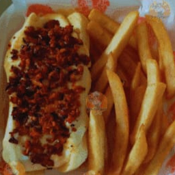 2 hot dog tocino, pan, salchicha, queso americano, jamon, tocino, jitomate, cebolla, rajas, capsut, mostaza, mayonesa, papas ala francesa ind y 1 refresco ind