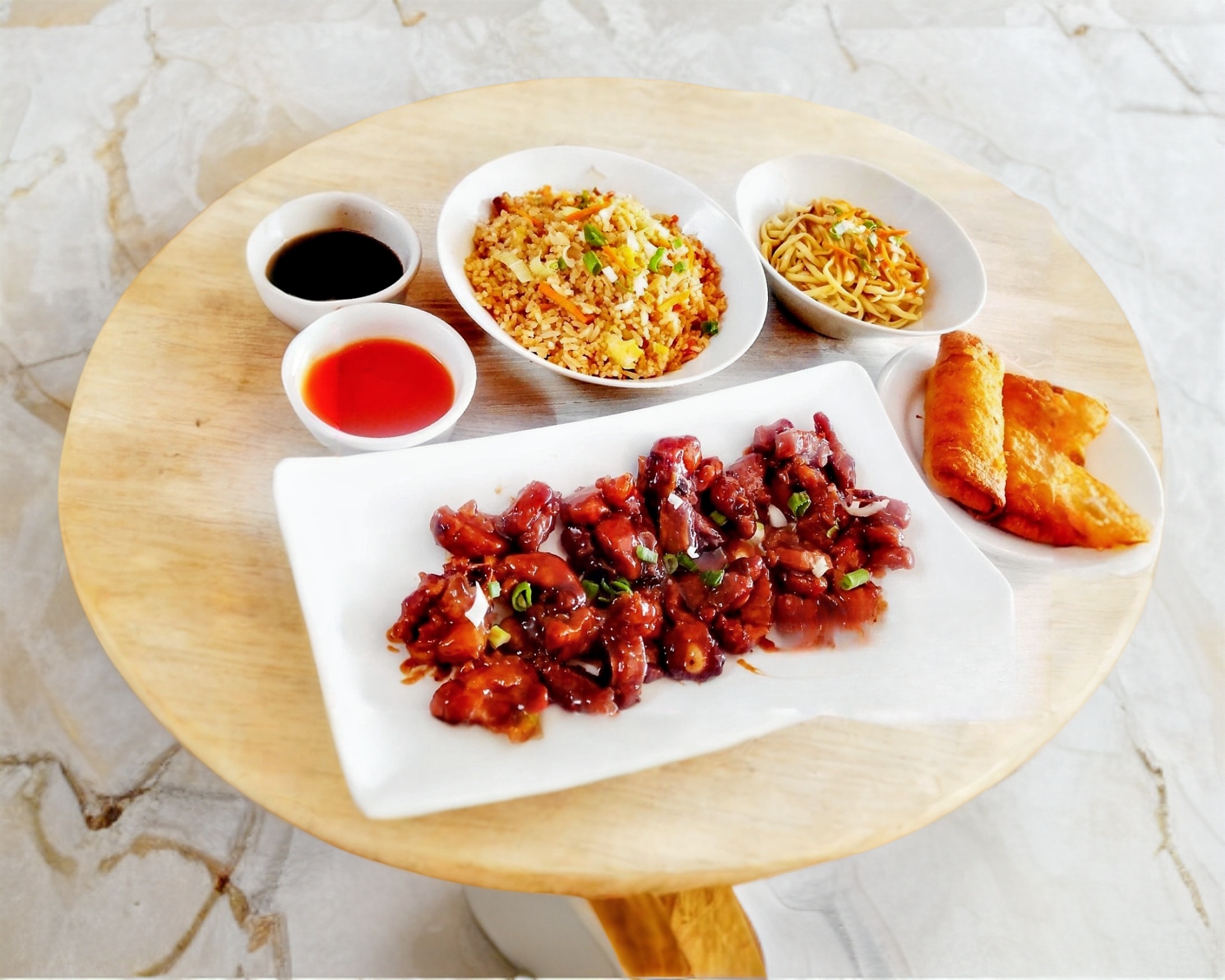 4 platillos para compartir: Pollo Agridulce, arroz frito, 1 spring roll, 1 cheese roll.