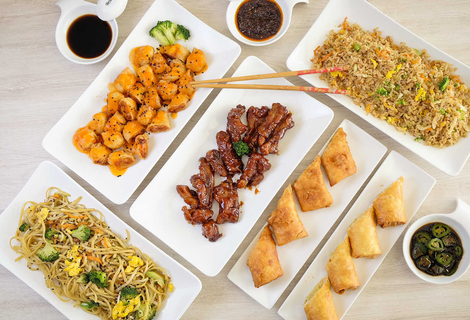 6 platillos para compartir: Costilla BBQ, pollo agridulce, tallarin frito, arroz frito, 2 spring roll y 2 cheese roll.