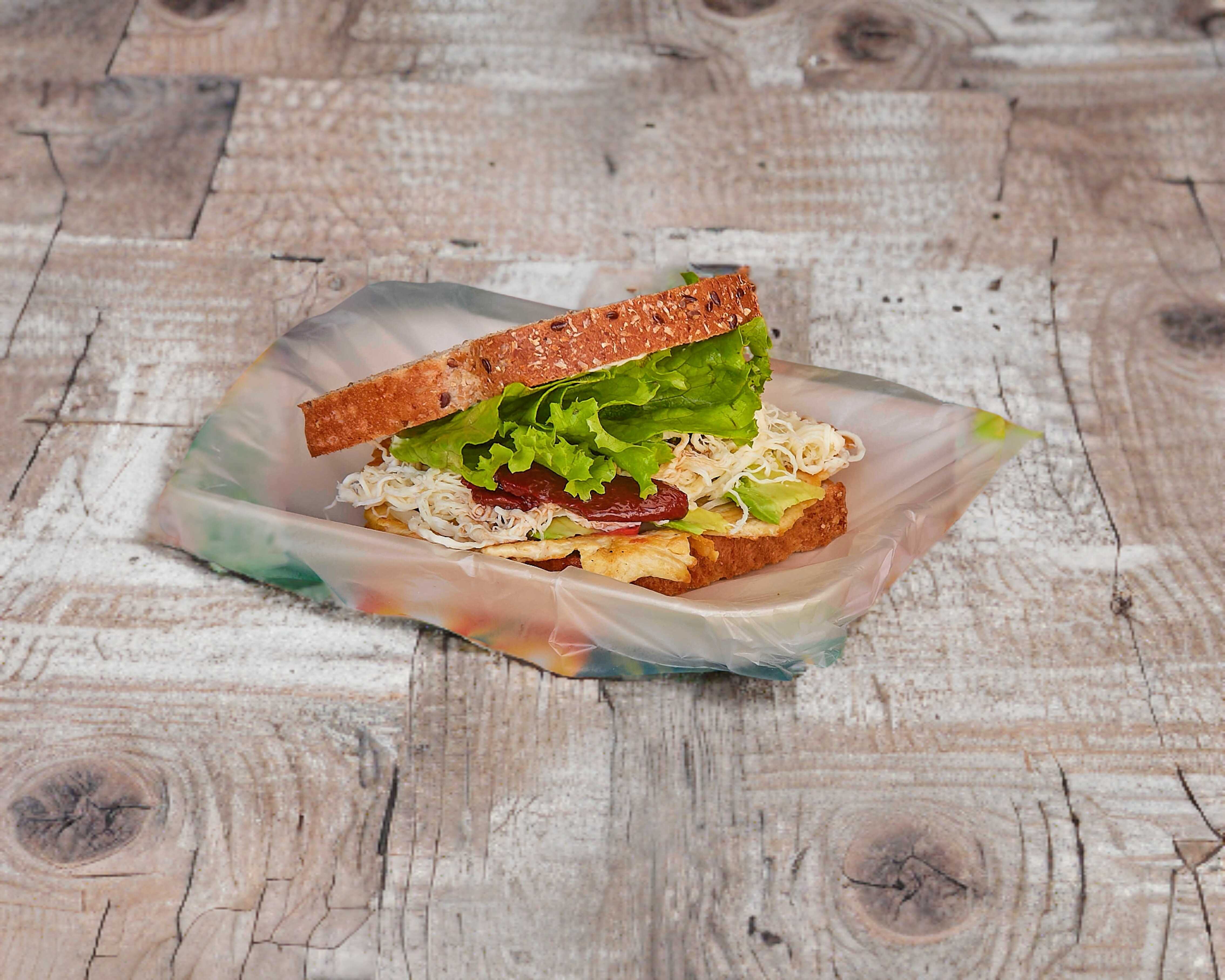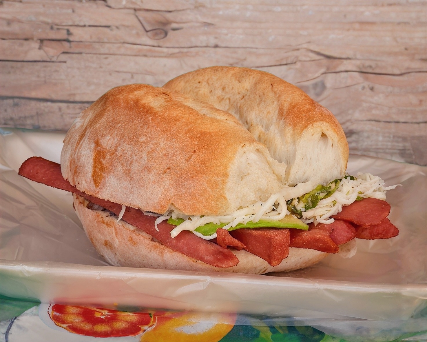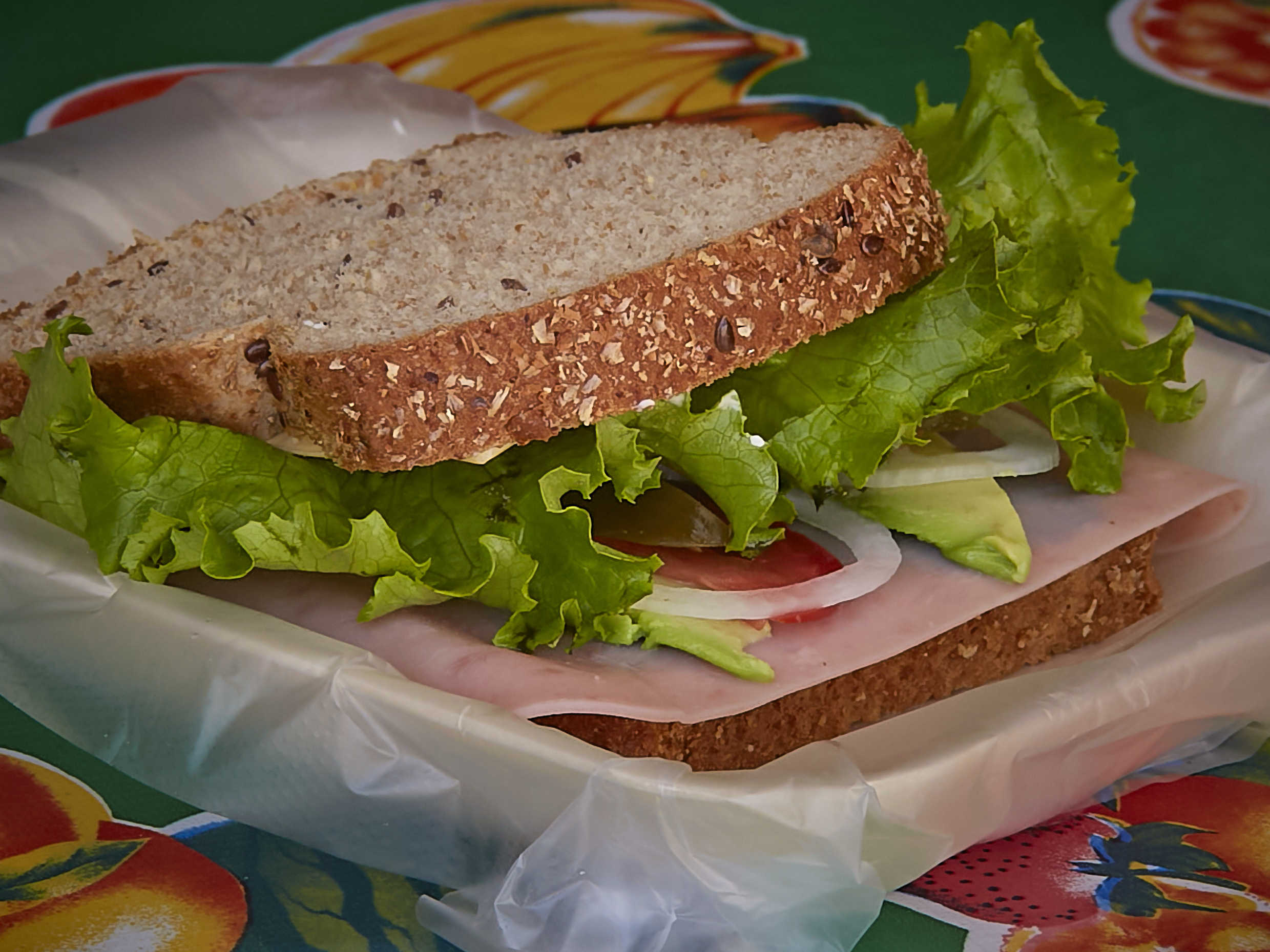Pan integral, jamón de pavo lechuga, tomate, cebolla, queso amarillo, mayonesa