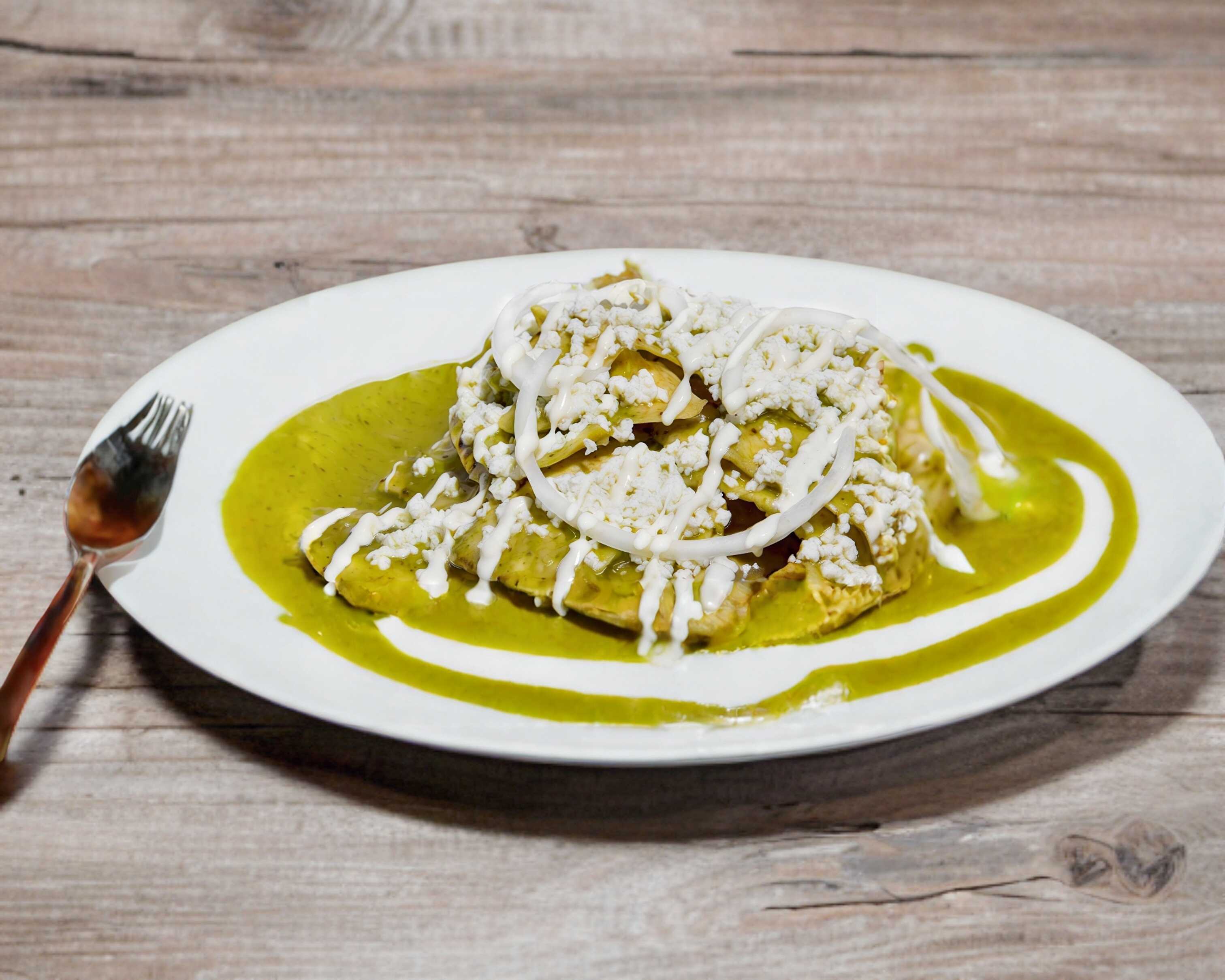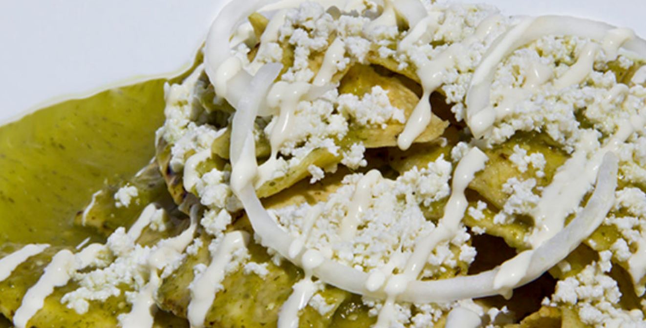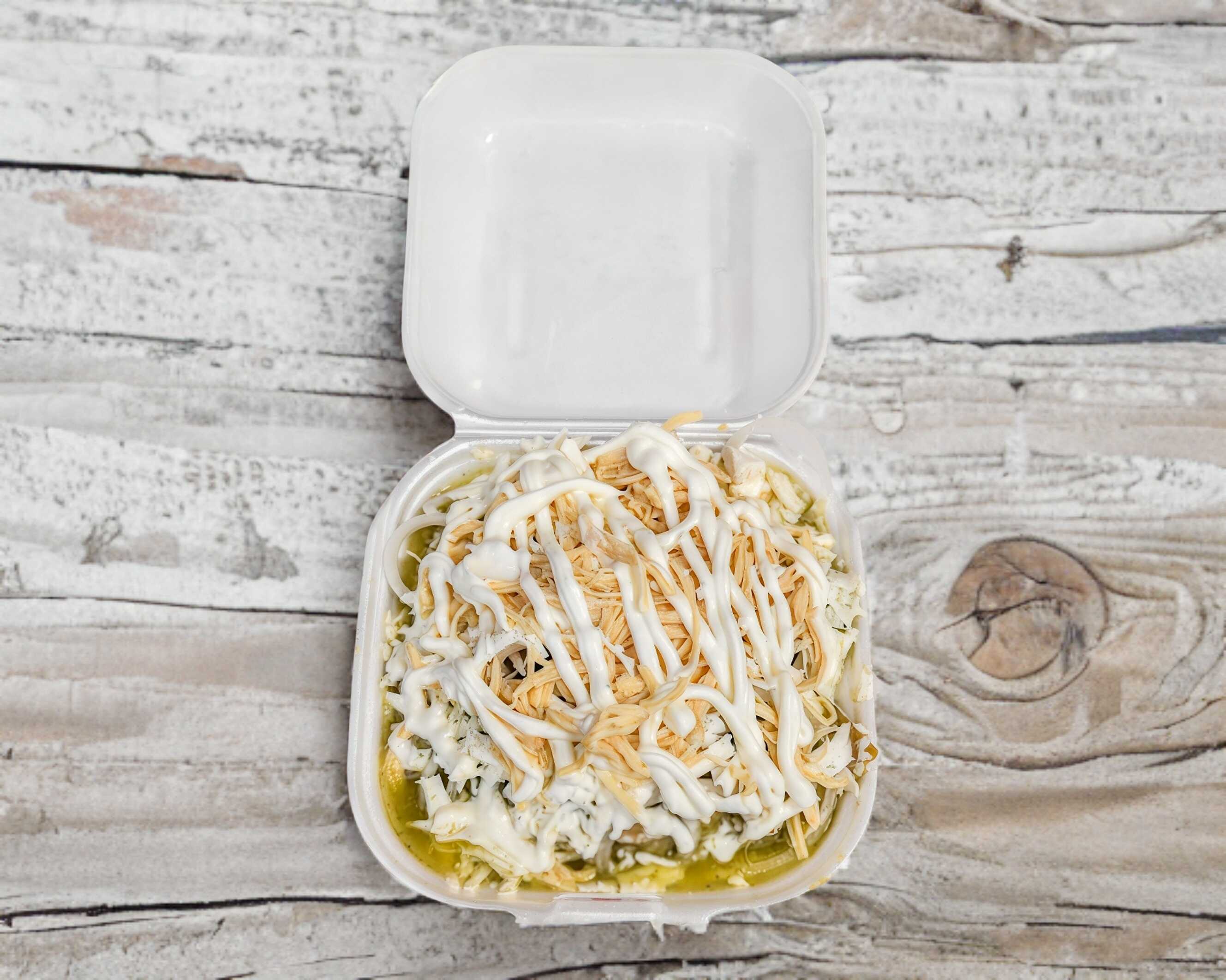 Charola chica de chilaquiles verdes, incluye: Pollo, crema,cebolla y queso