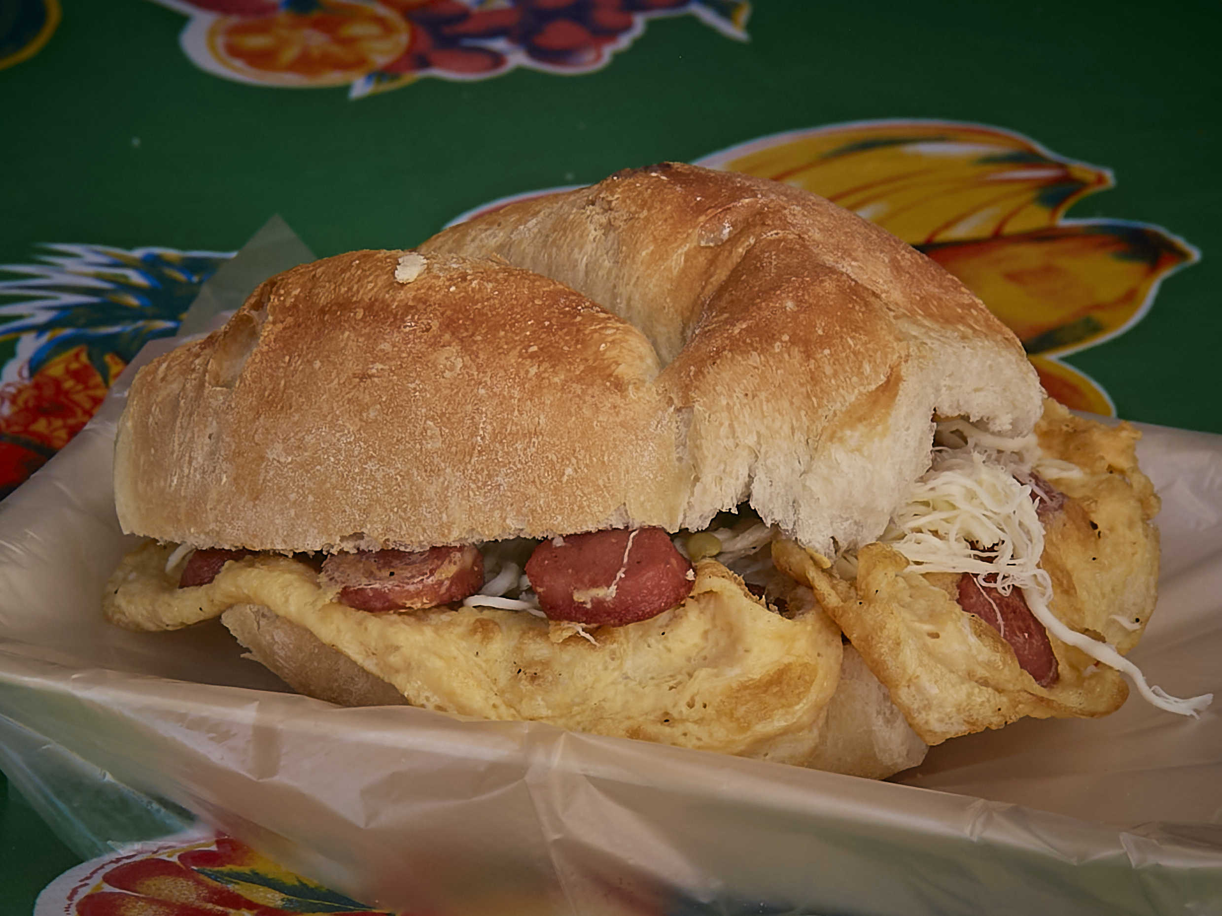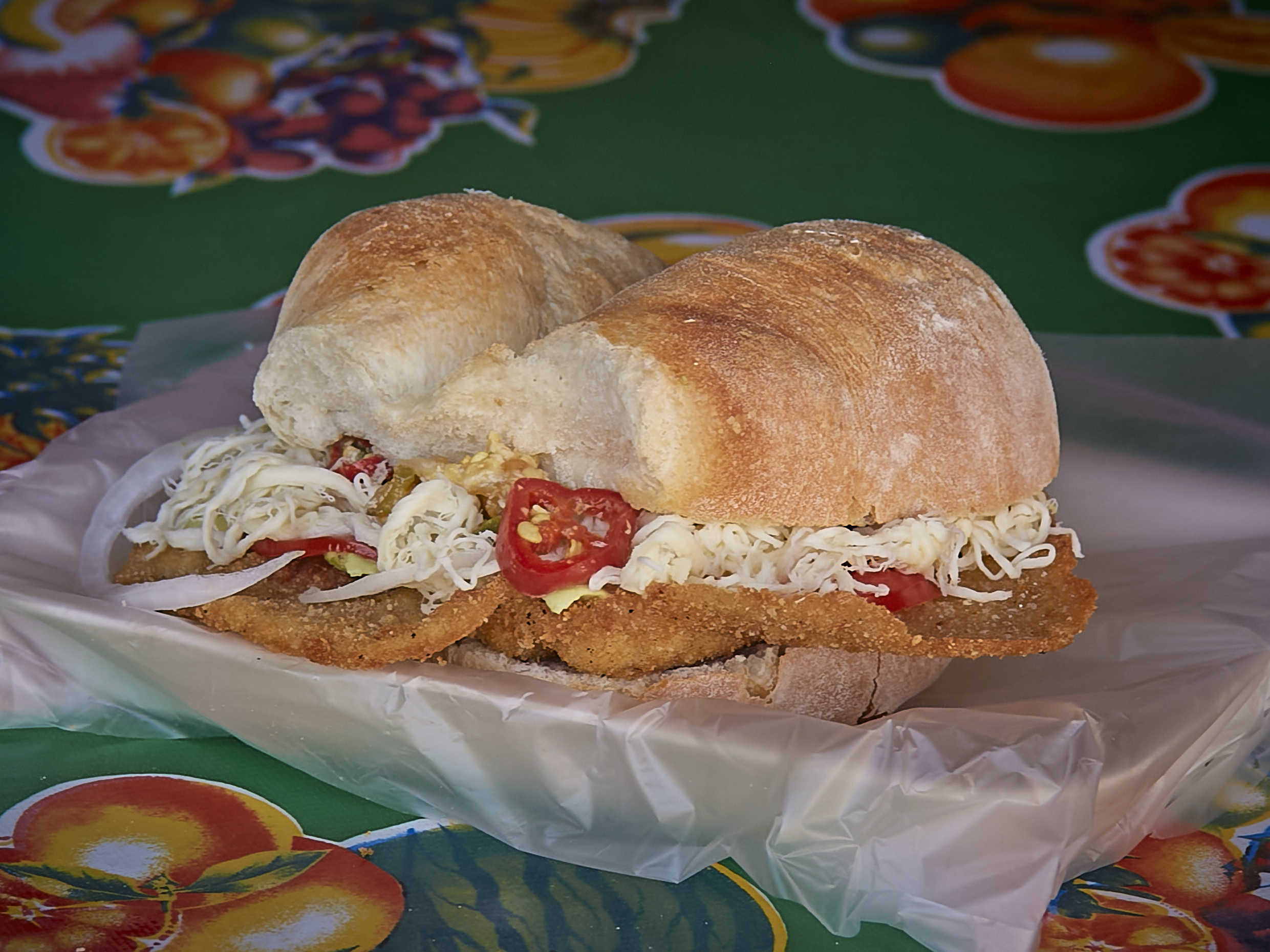 Pan de linaza, pechuga asada, lechuga, tomate, cebolla, quesillo y frijolitos
