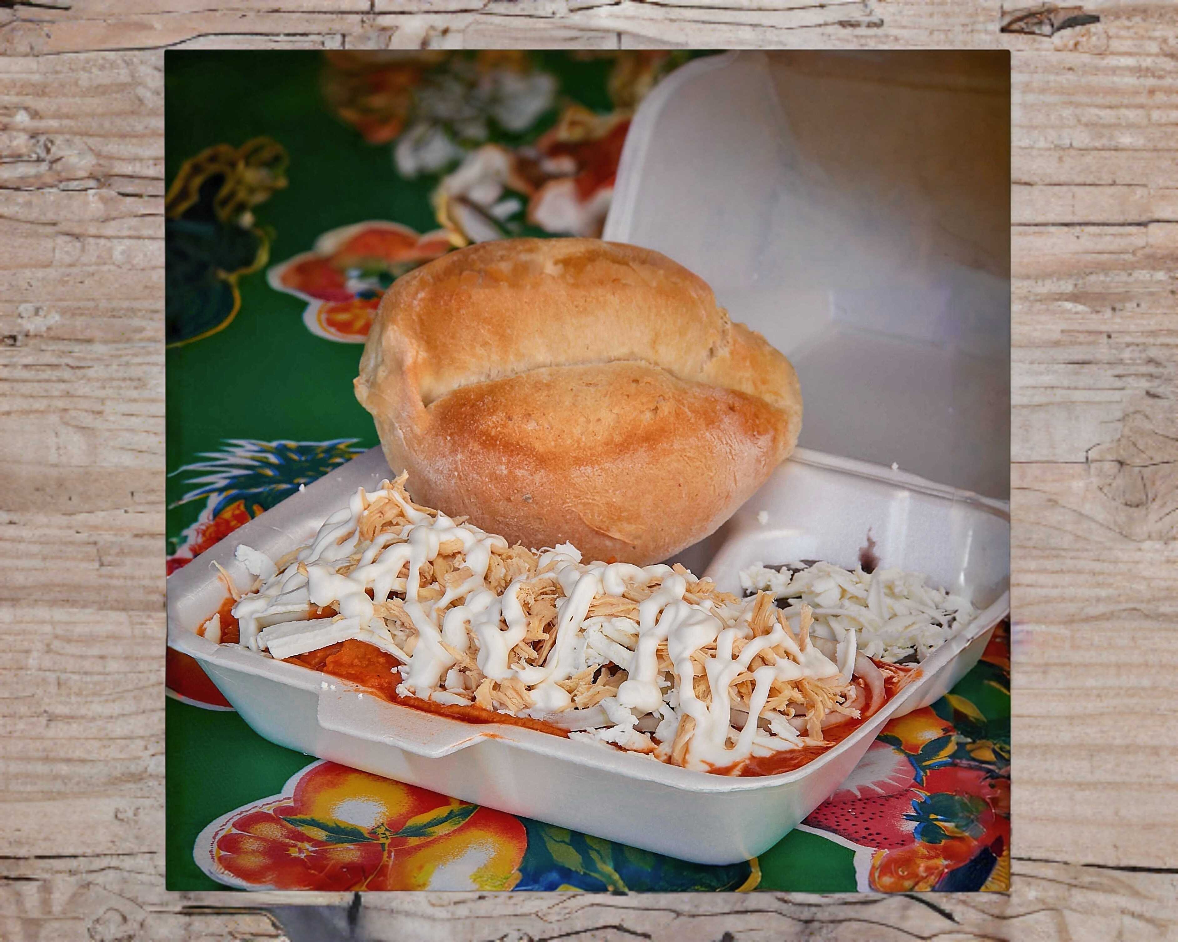 Torta de chilaquiles con crema, pollo,cebolla y queso