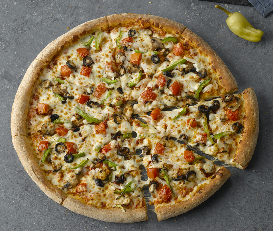 Vegetales frescos: champiñones, cebolla, pimiento verde, jitomate, aceitunas negras y queso mozzarella en masa tradicional de 14"