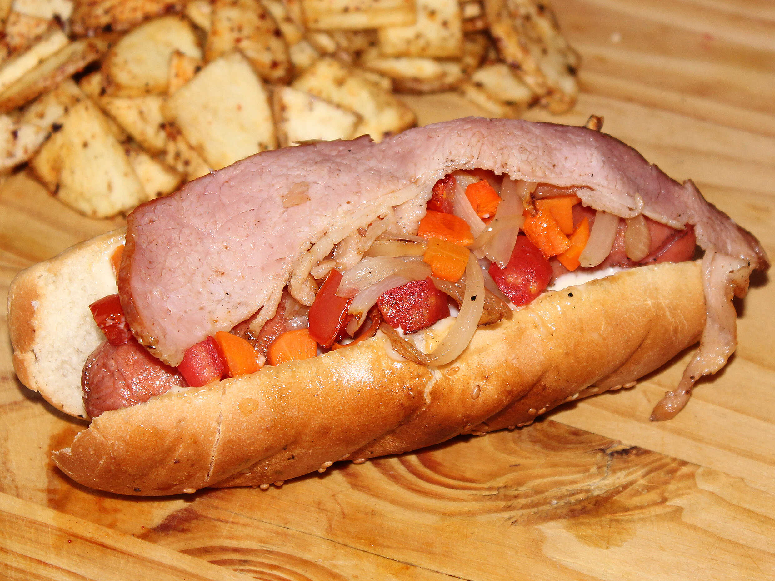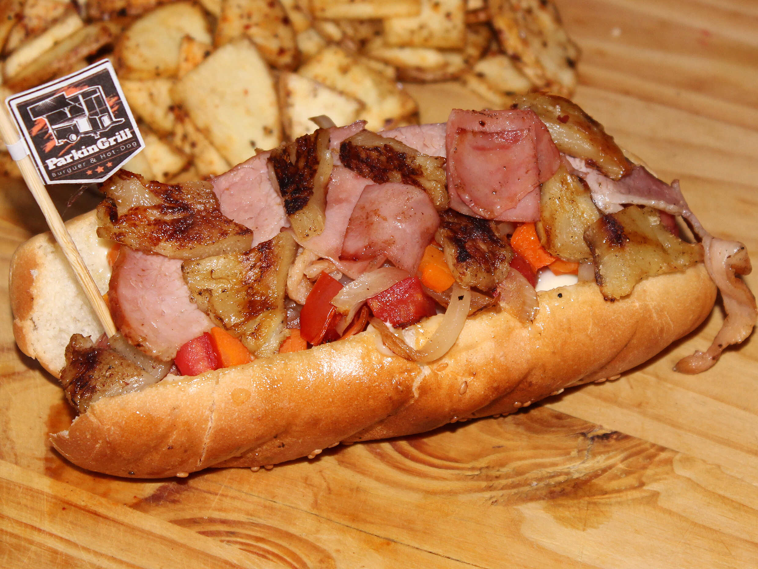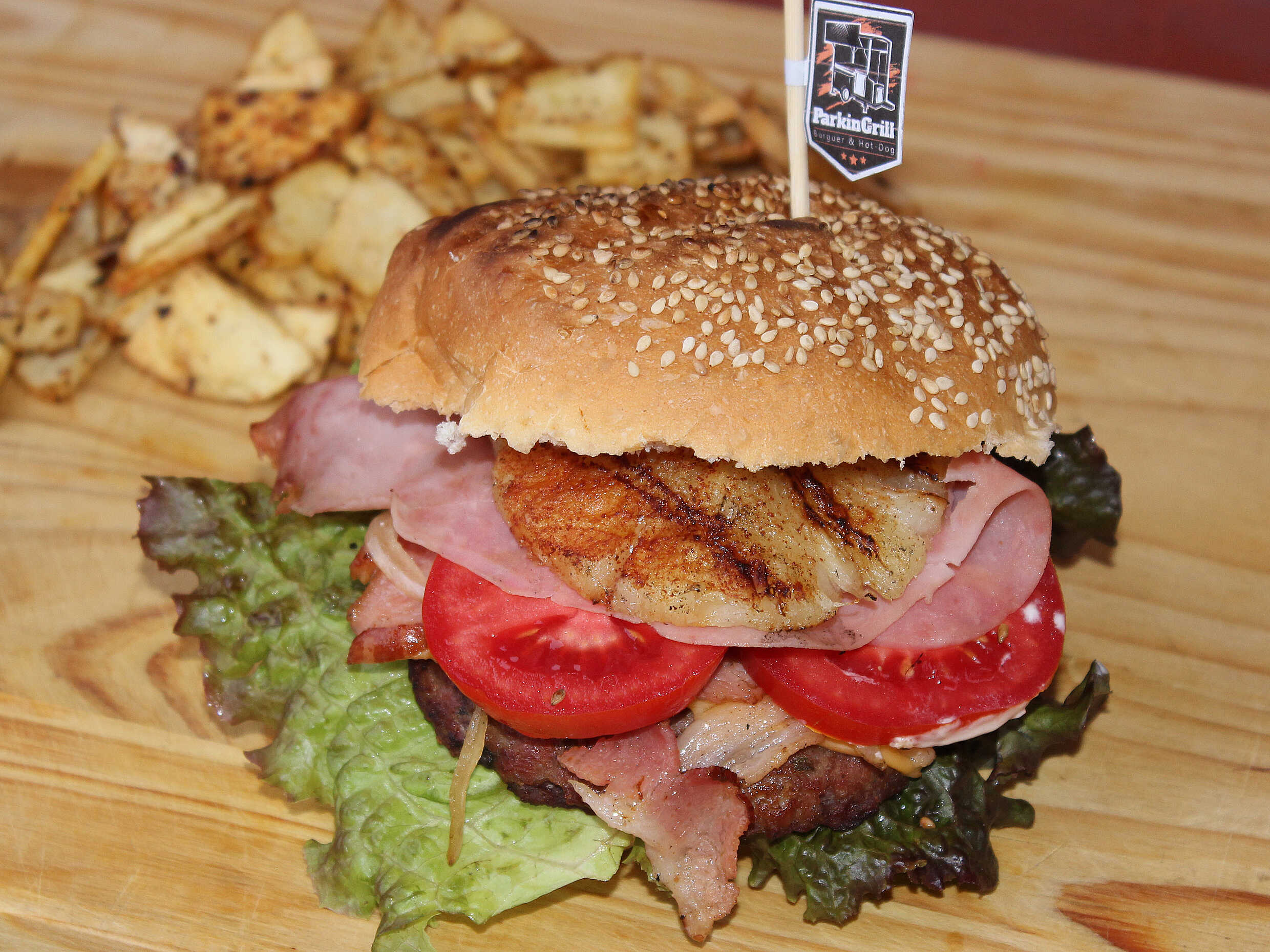 Pan artesanal acompañado de mayonesa, lechuga, cebolla caramelizada, jitomate, queso americano, tocino, piña y jamón.