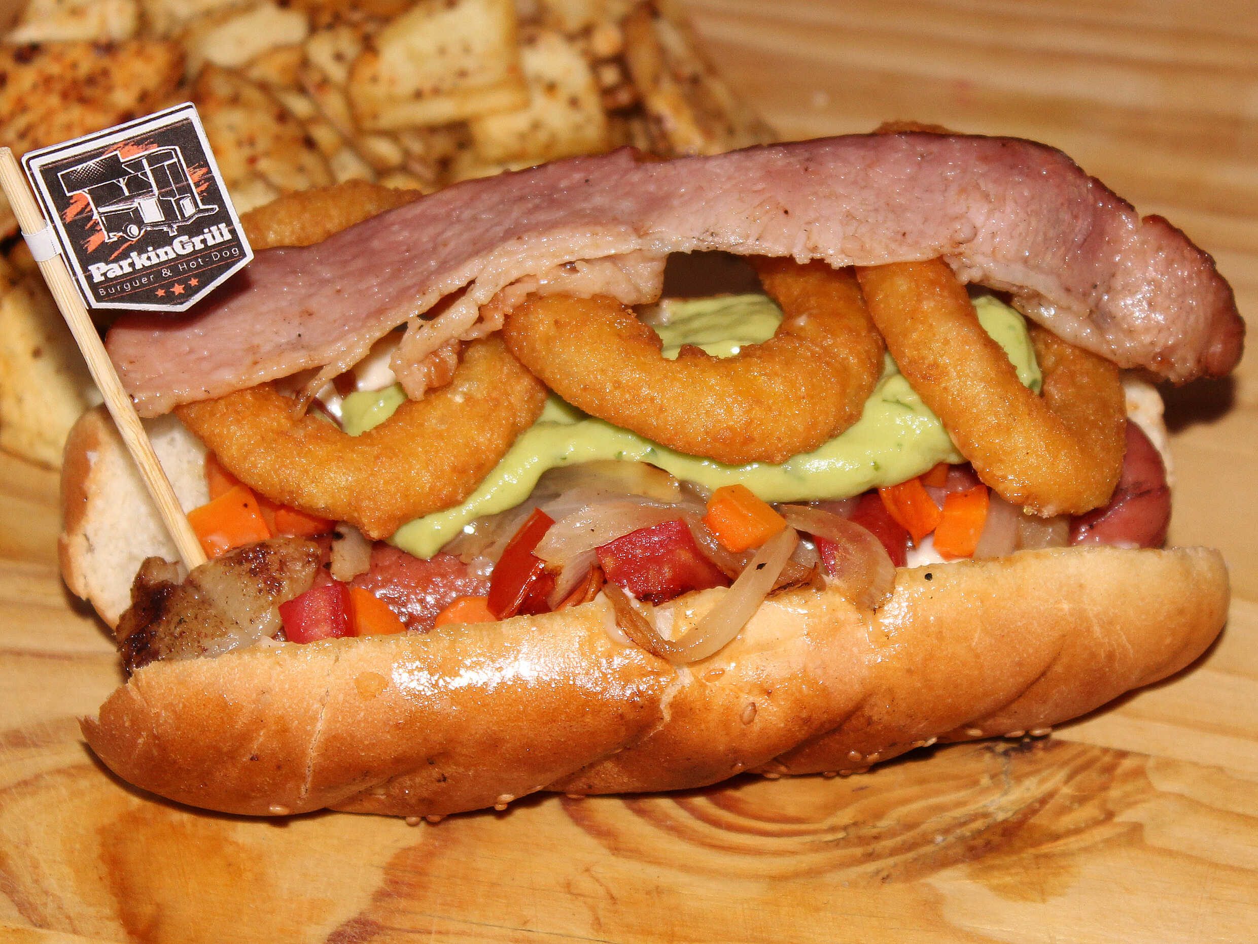 Pan artesanal acompañado de mayonesa, zanahoria, jitomate, tocino, cebolla caramelizada, aros de cebolla y guacamole.