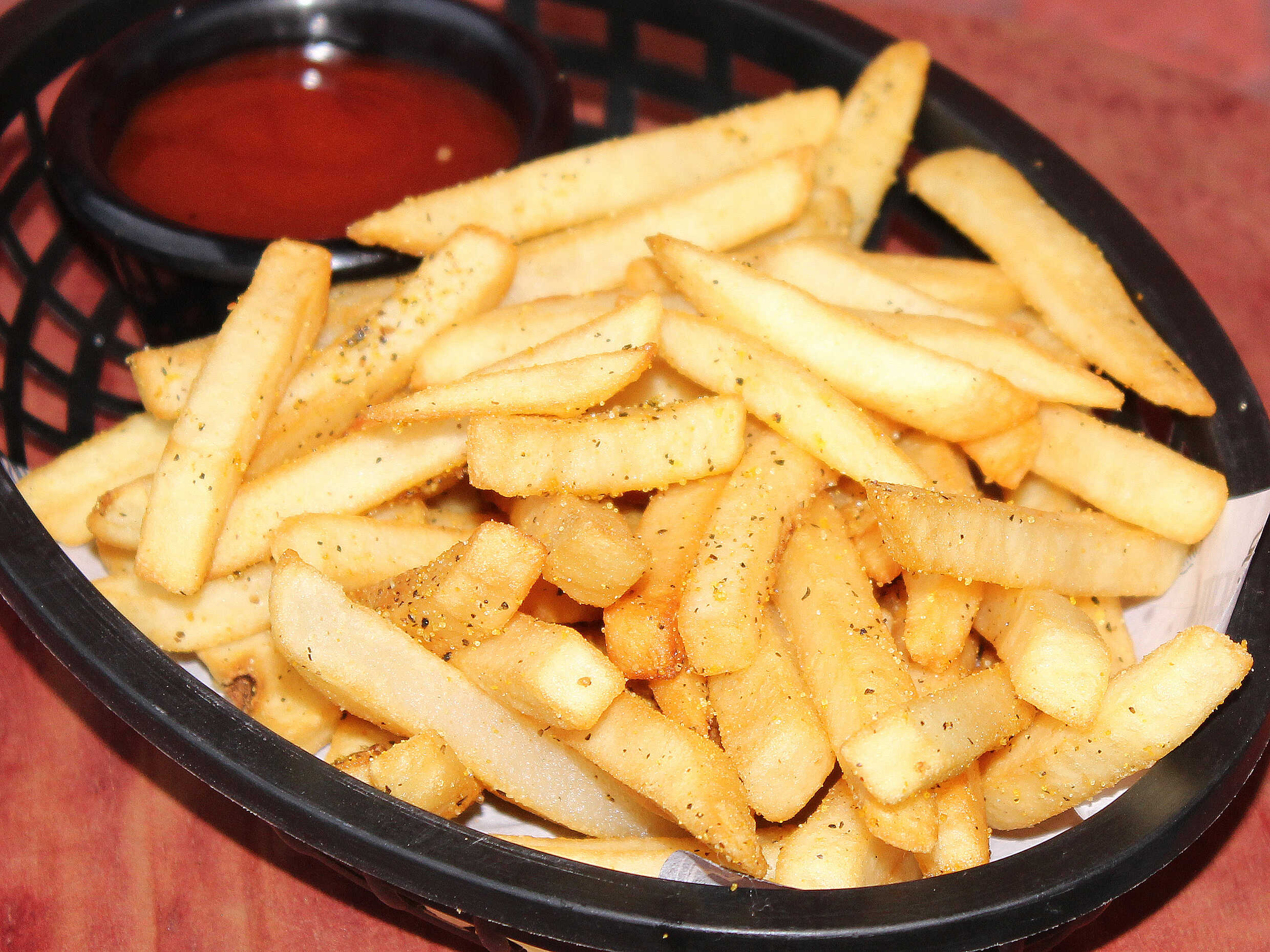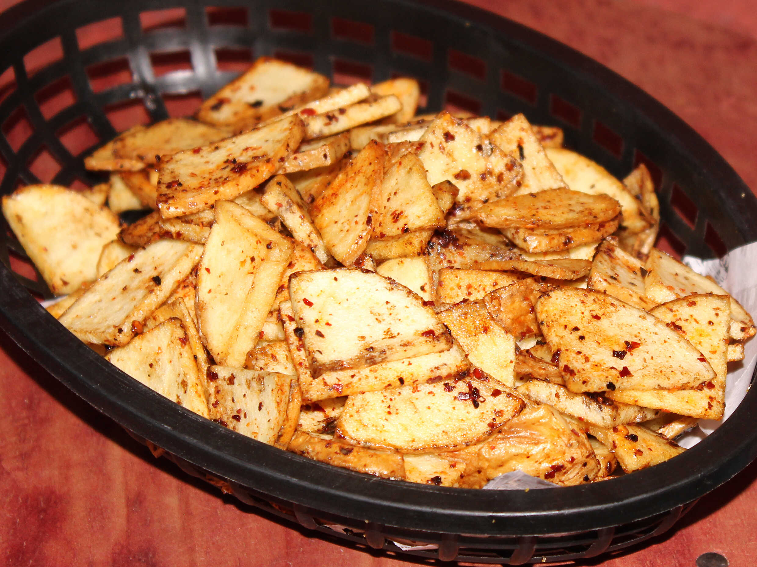 Tipo chips, bañadas en salsa negra, mezcla de chiles en polvo.