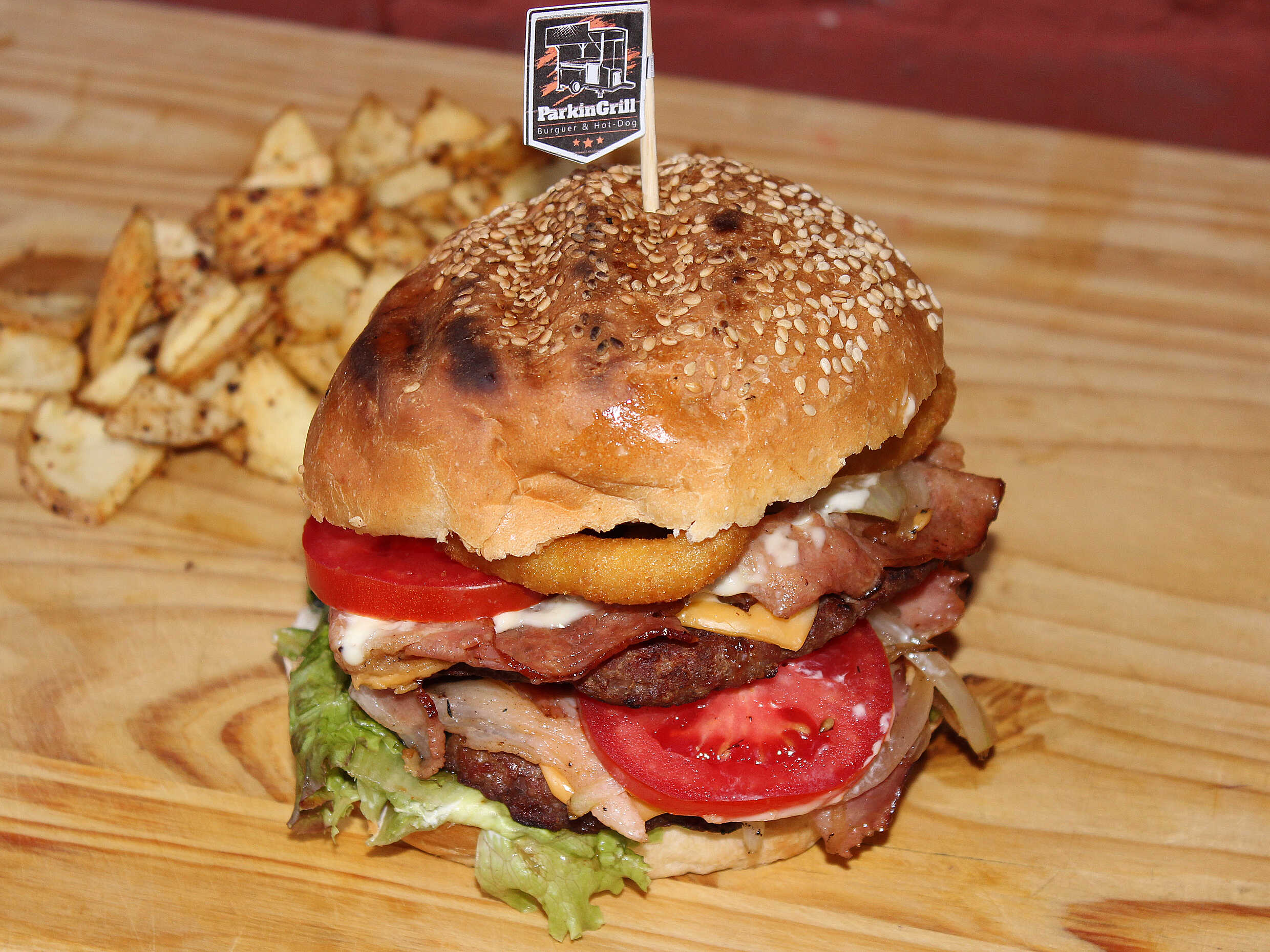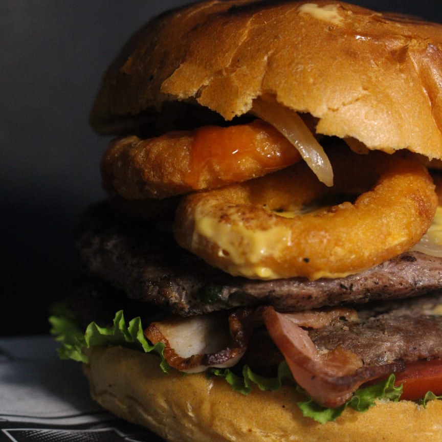 Pan artesanal acompañado de mayonesa, lechuga, doble carne de res, cebolla caramelizada, tocino, jitomate, queso americano, aros de cebolla.