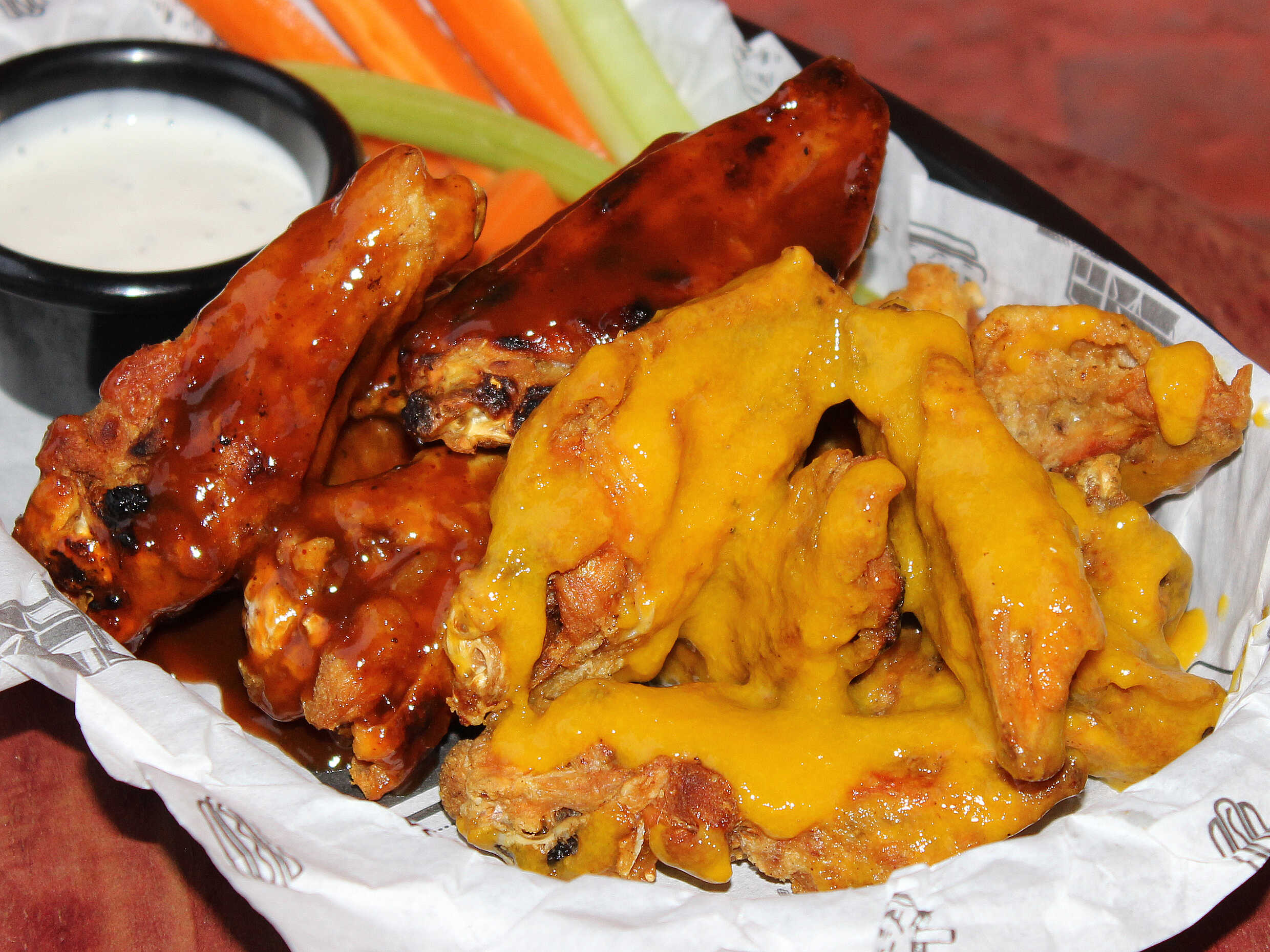 7 Piezas de alitas bañadas en salsa de su elección, acompañadas de vegetales y dip de ranch.