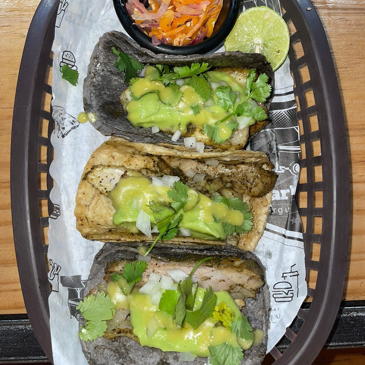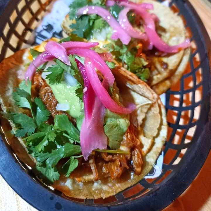 Doble tortilla, carne de res acompañados de cebolla, cilantro, habaneros curtidos, guacamole y limón.
