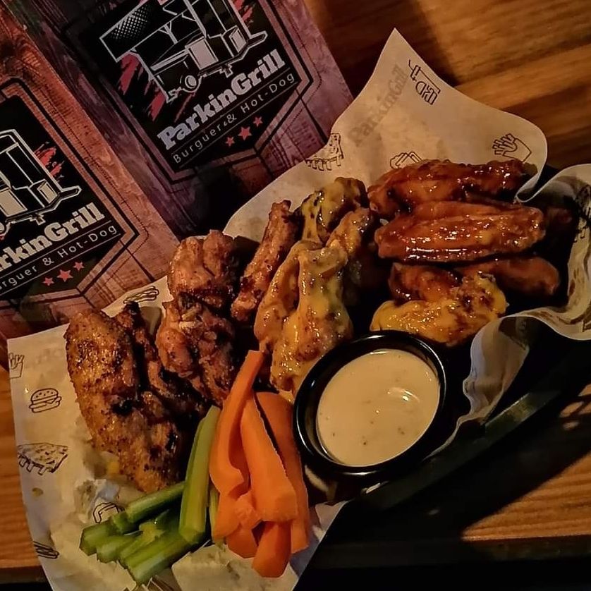 16 Piezas de alitas bañadas en salsa de su elección, acompañadas de vegetales y dip de ranch.