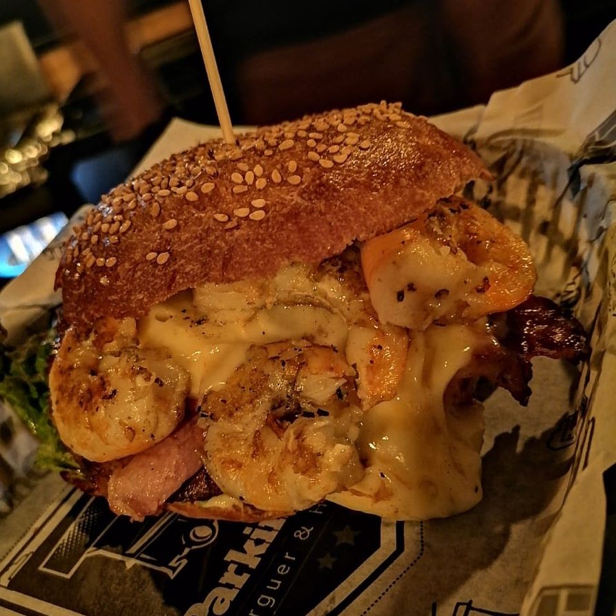 Pan artesanal acompañado de mayonesa, lechuga, carne de res, camarones, cebolla caramelizada, jitomate, queso americano, tocino, queso fundido.