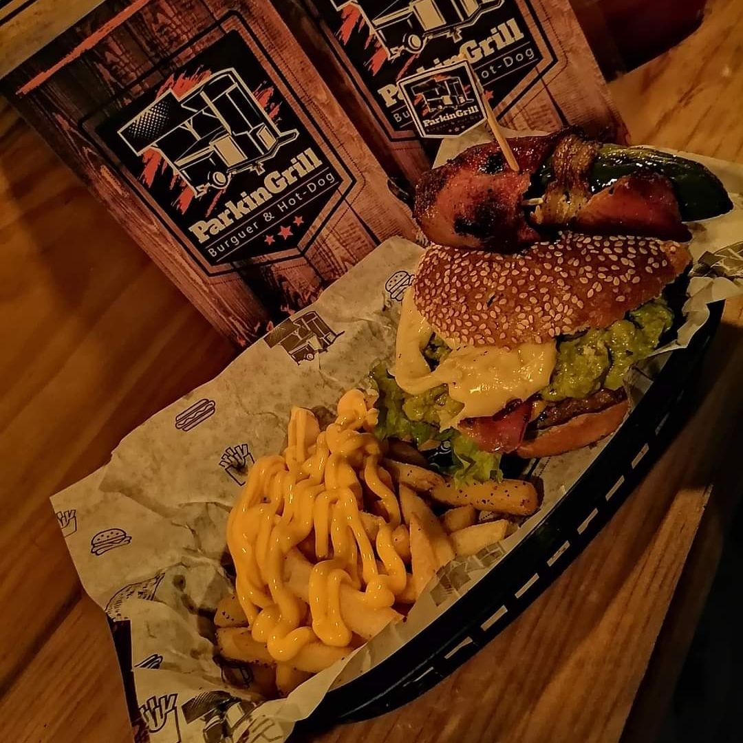 Pan artesanal acompañado de mayonesa, lechuga, carne de res, cebolla caramelizada, jitomate, queso americano, tocino, guacamole, queso fundido y chile toreado.