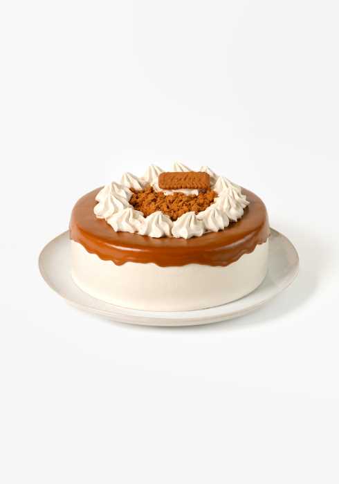 Bizcocho sabor vainilla, bañado en tres leches sabor Lotus, relleno de crema Lotus, cubierto de crema sabor Lotus decorado con galleta Lotus.