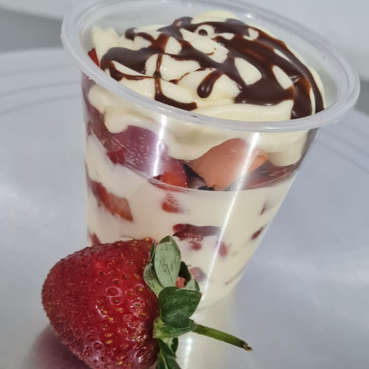 Combinacion de fresas naturales con crema natural con un toque de cobertura de chocolate