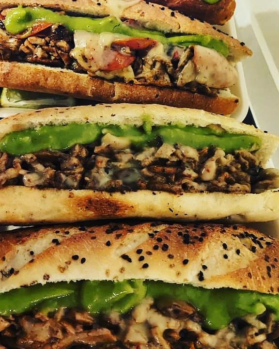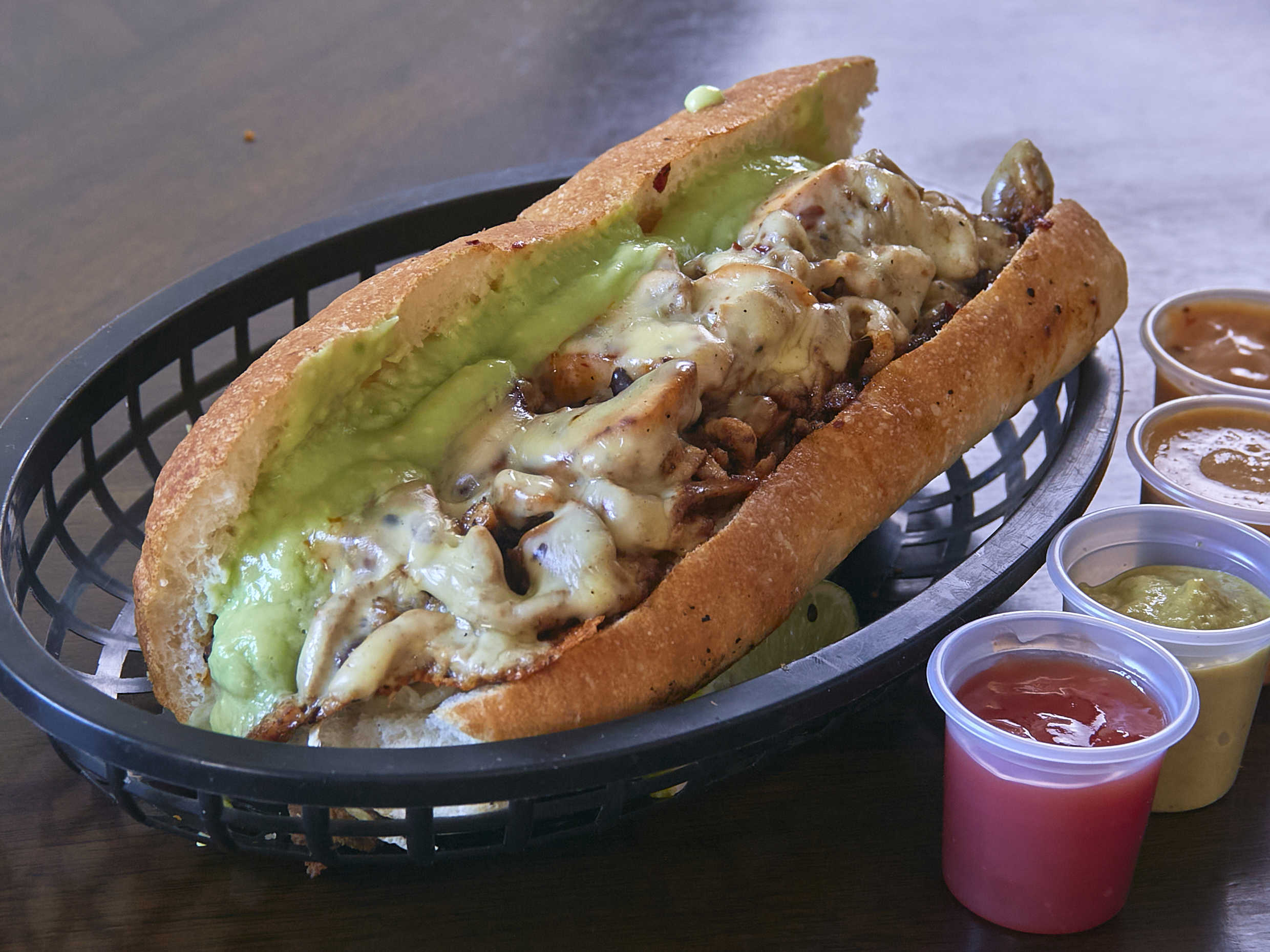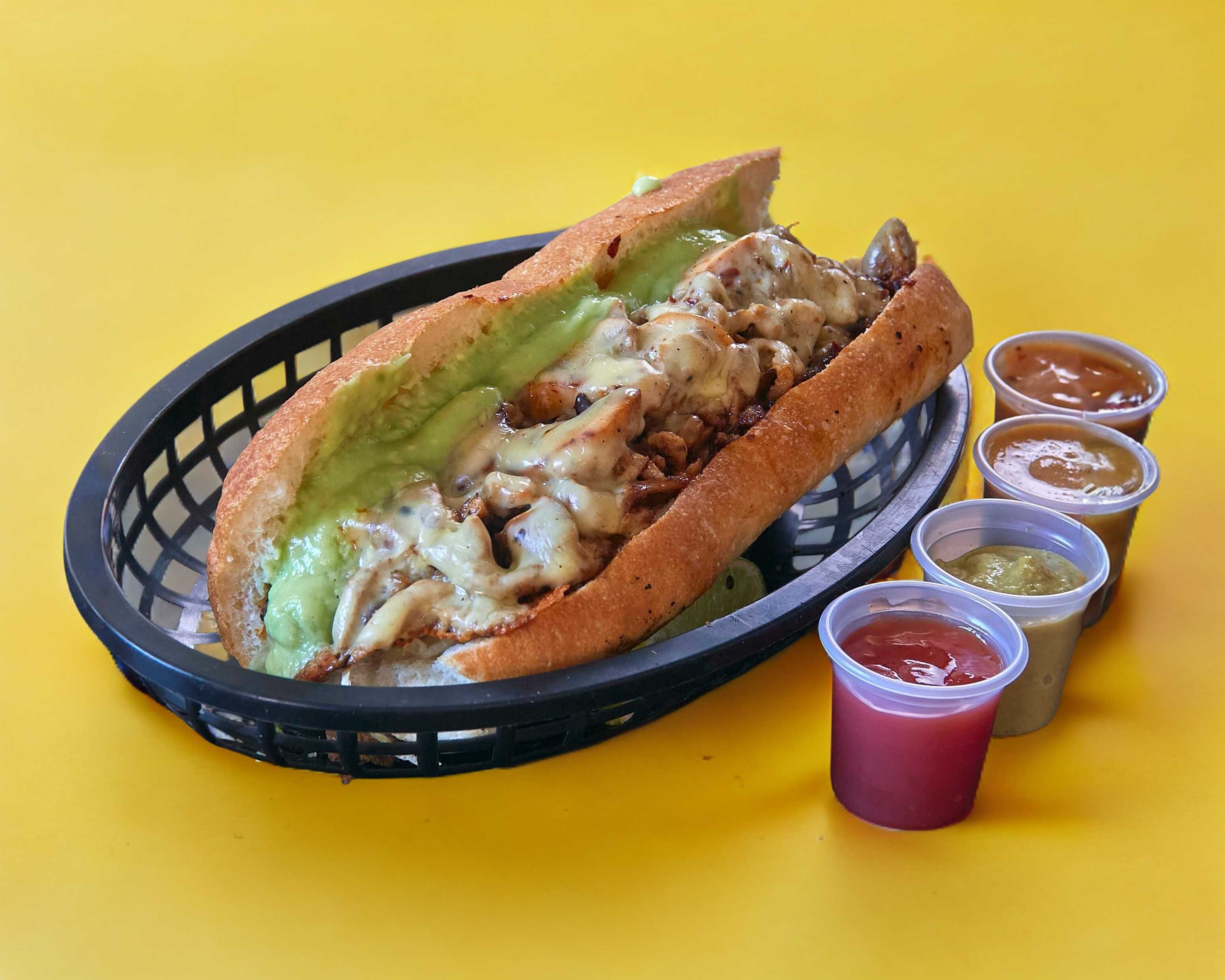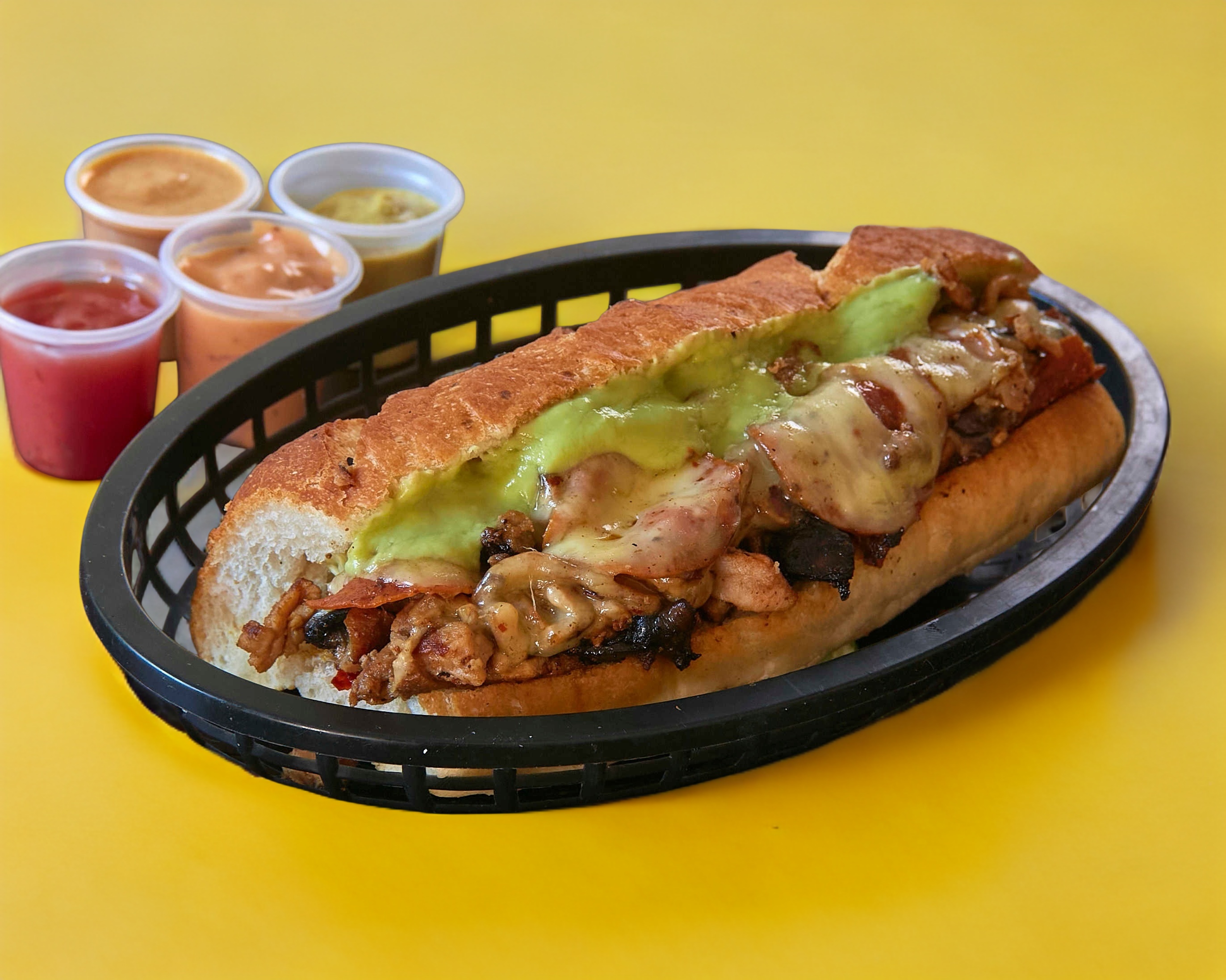 Carne asada, queso gouda gratinado, guacamole, pimIentos y cebolla asados.