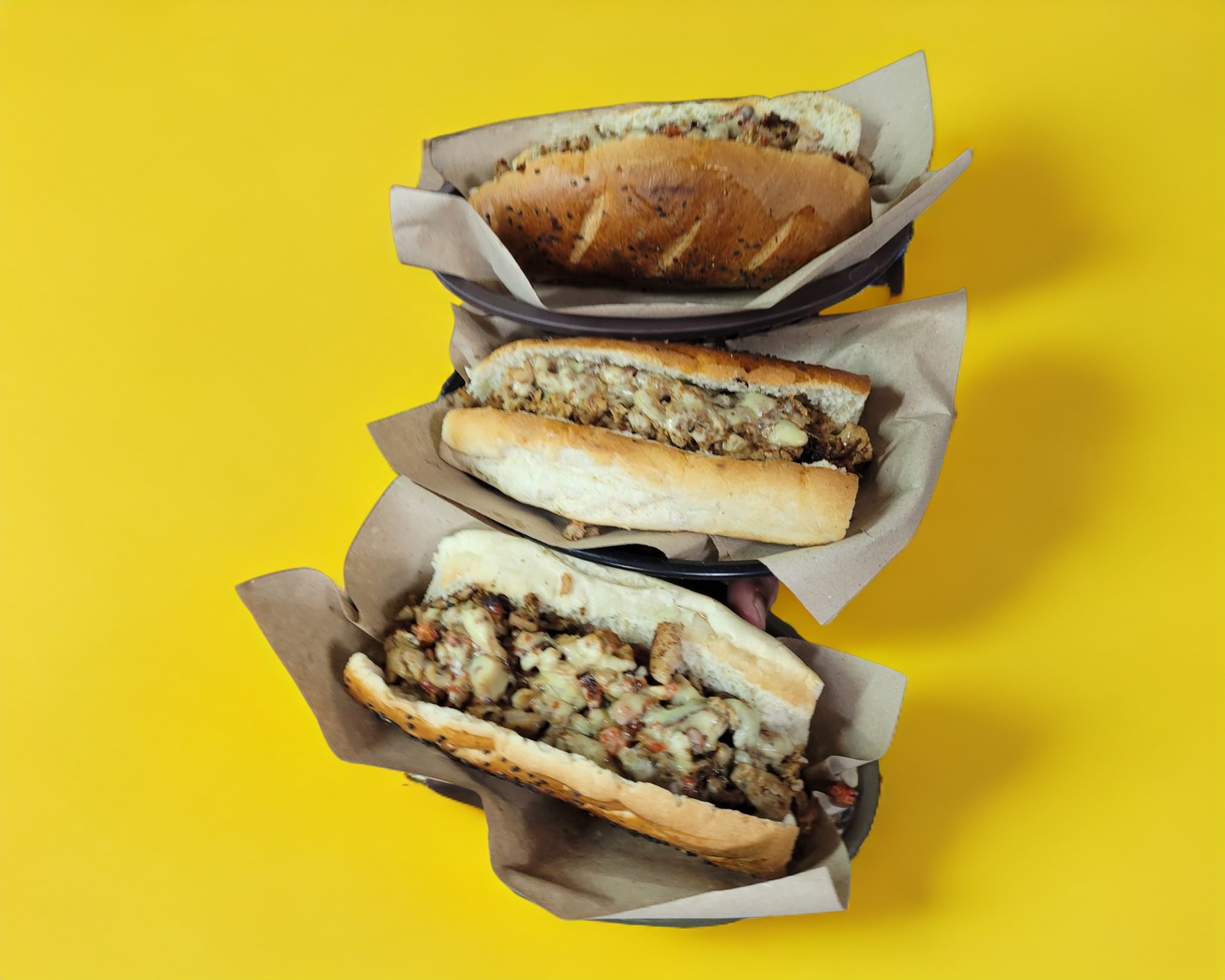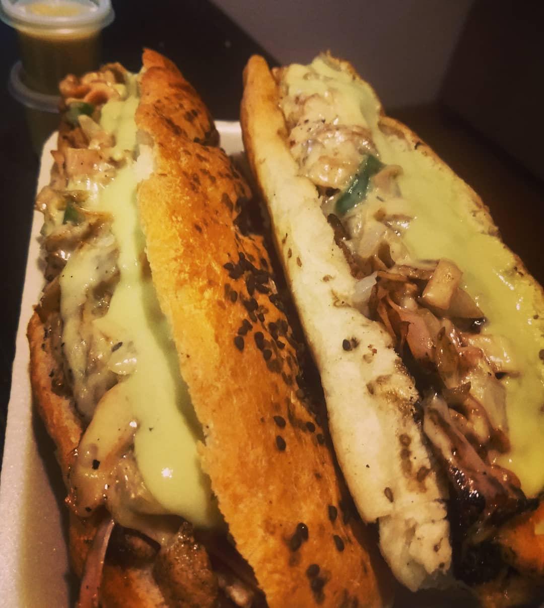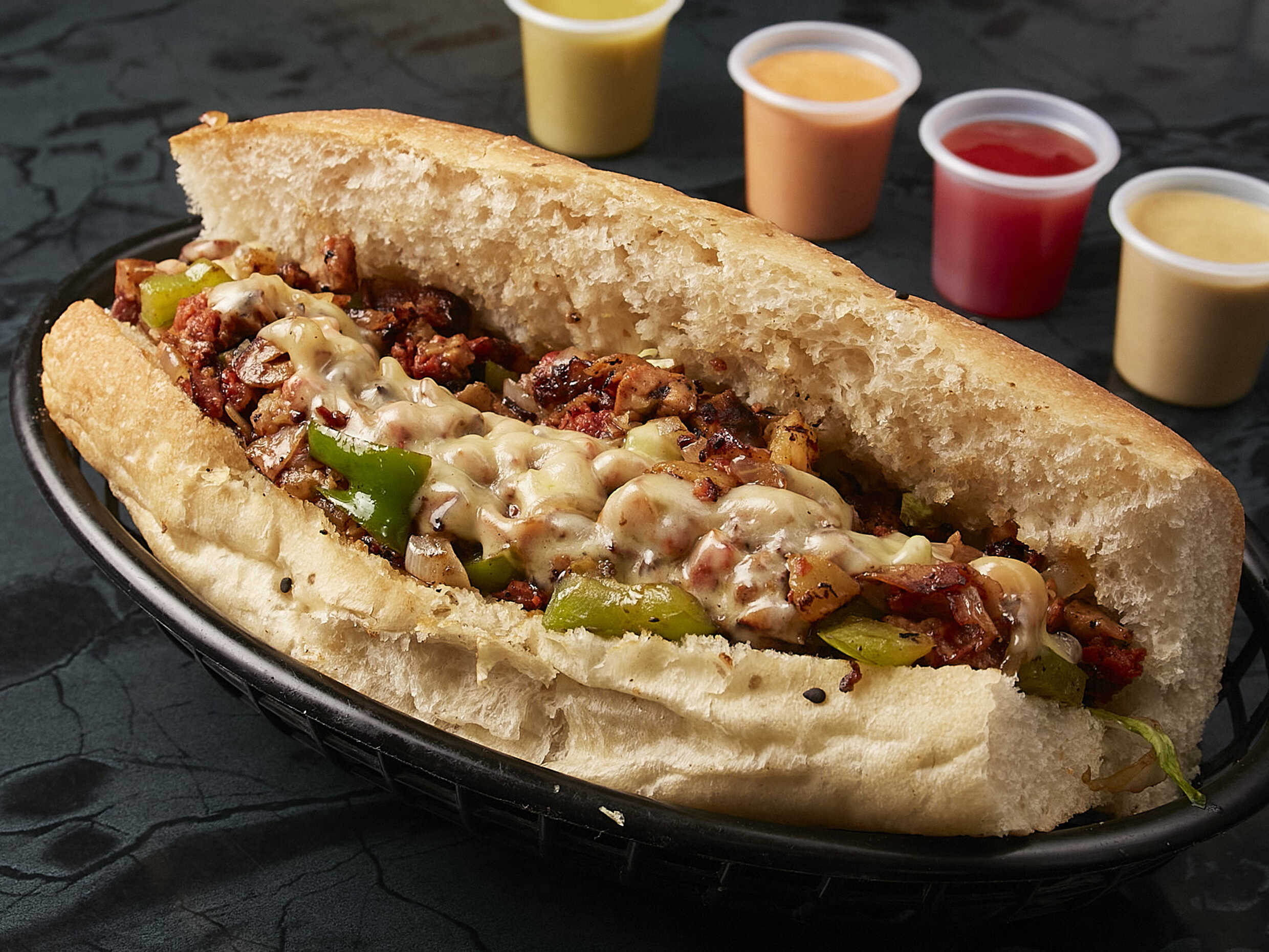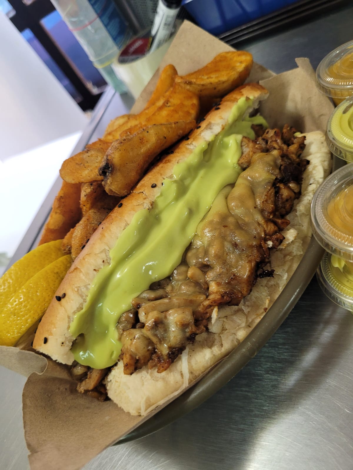 Carne asada, queso gouda gratinado, guacamole, pimIentos y cebolla asados.