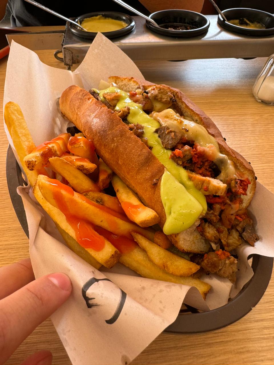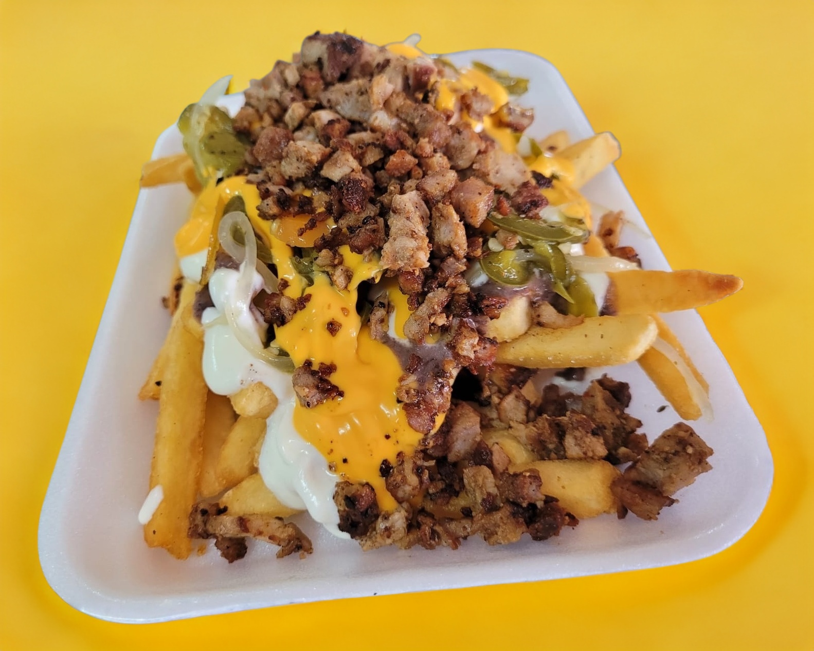 Papas a la francesa bañadas con queso amarillo liquido, frijolitos, crema y jalapeños. Además (120gr de carne) asada de pata de perro. Excelente opción para compartir. Combinación perfecta entre las papitas a la francesa y la carne!