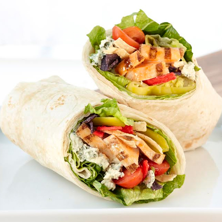 Wrap de fajitas sazonadas de pollo, cebolla, pimientos, lechuga, jitomate con aderezo ranch.