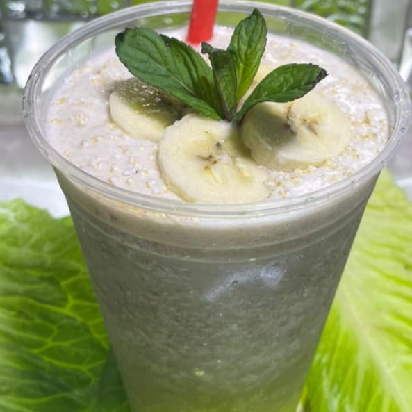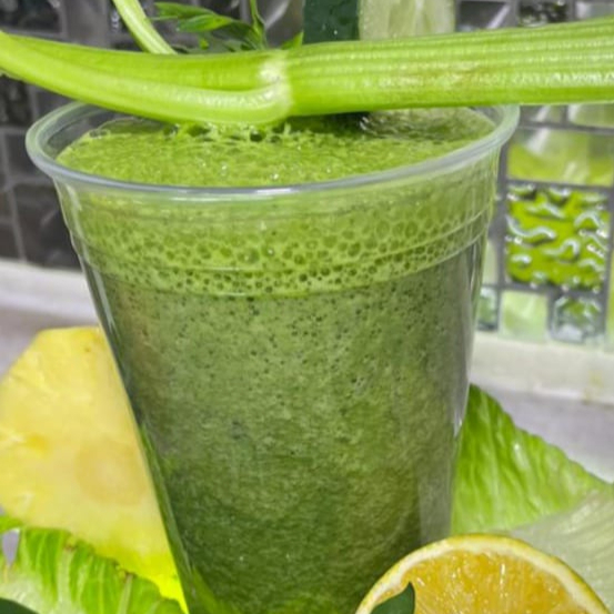 Jugo de naranja recién hecho con nopal, piña, espinaca y apio.
