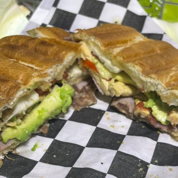 Pechuga asada, jamón de pavo, queso panela o quesillo, aguacate, jitomate, mayonesa y frijoles.