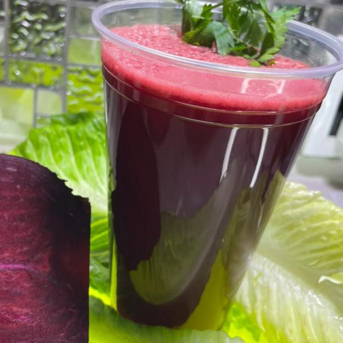 Jugo de naranja recién hecho con piña, betabel, zanahoria y apio.