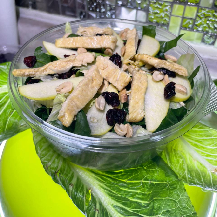 Mix de lechugas, espinaca, manzana, cacahuate, queso panela y pechuga o atún.