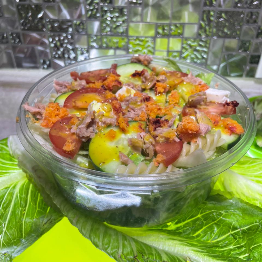 Mix de lechugas, pasta, espinaca, pepino, tomate, zanahoria rallada, queso panela y pechuga o atún.
