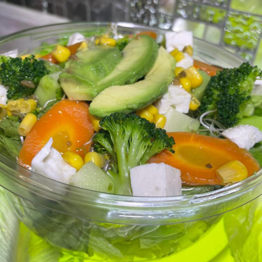 Mix de lechugas, espinaca, germen de trigo, verduras al vapor, queso panela y pechuga o atun