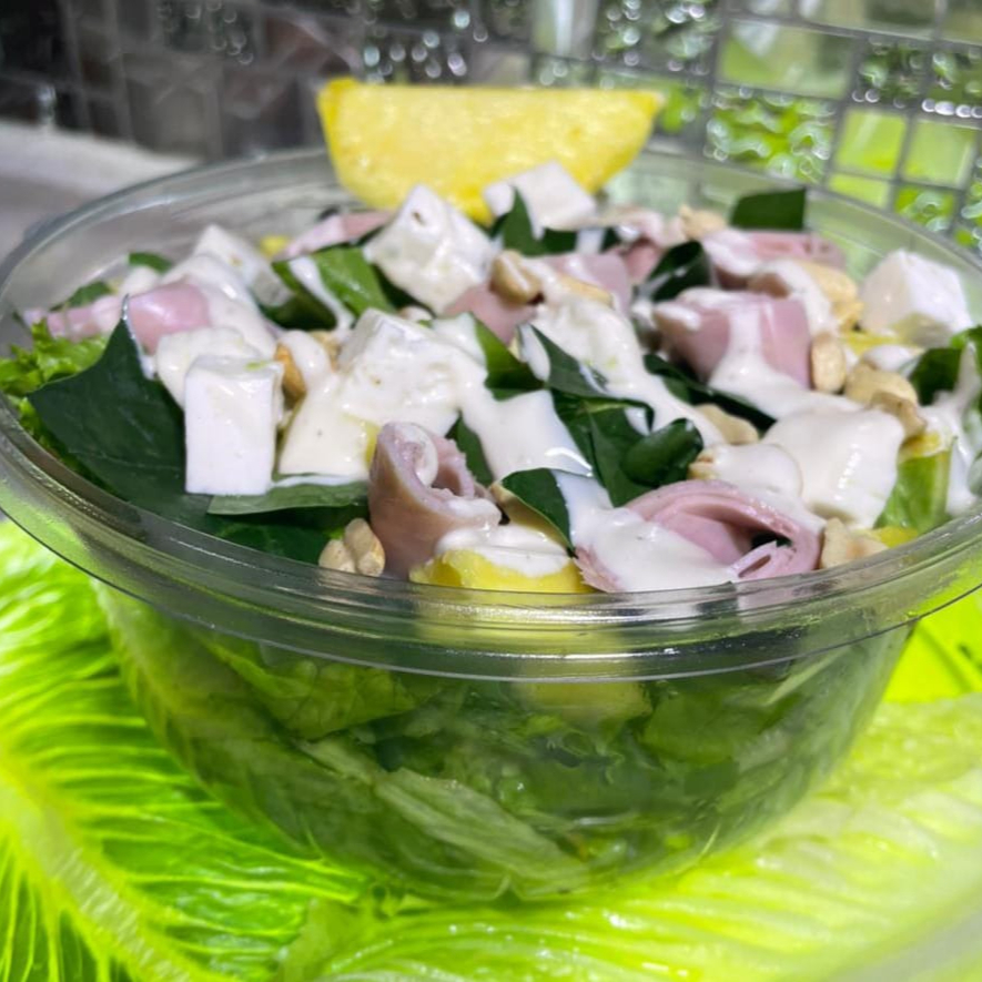 Mix de lechugas, espinaca, jamón de pavo, piña, nuez y pechuga o atun