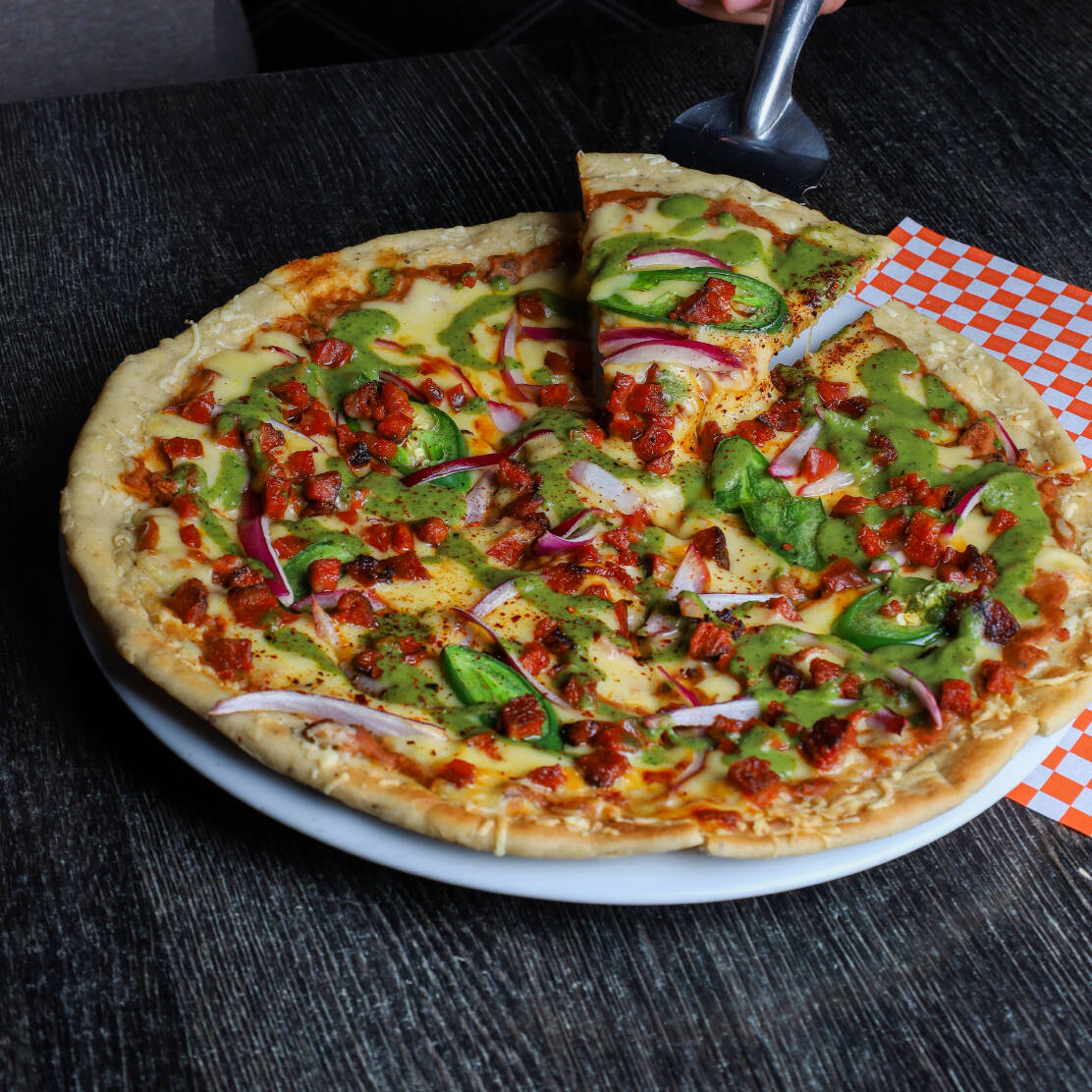 Suculenta Pizza con una Base de Frijol, Chorizo, Cebolla y Pimientos aderezada con una salsa ligera. Masa 100% hecha en casa. Pizzas 8 Porciones. Quesos de la casa: Cheddar, Mozarrella