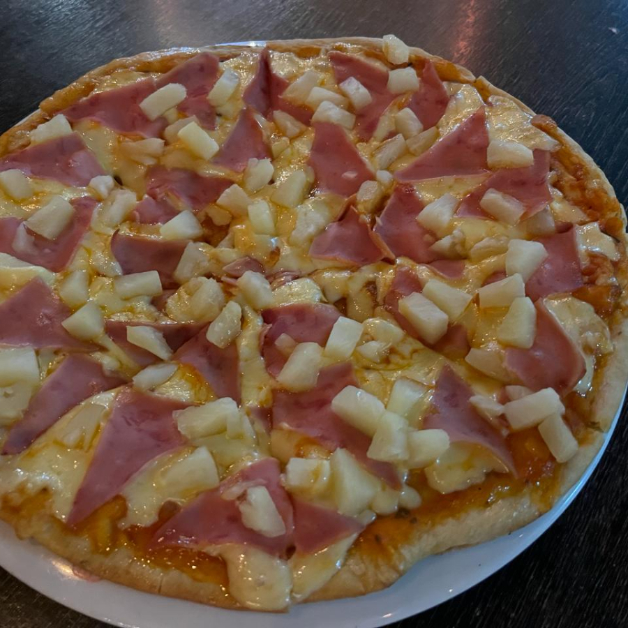 Apetitosa Pizza con Jamón, Piña y nuestra Mezcla de quesos de la casa. Masa 100% hecha en casa. Pizza 8 porciones. Quesos de la casa: Cheddar, Mozarrella