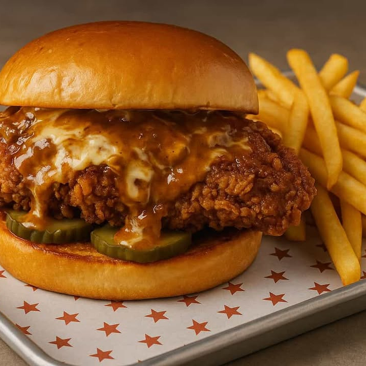 Hamburguesa de pollo crujiente por fuera, jugosa por dentro, acompañada de papas fritas y refresco. Adereza con tu salsa favorita y disfruta.