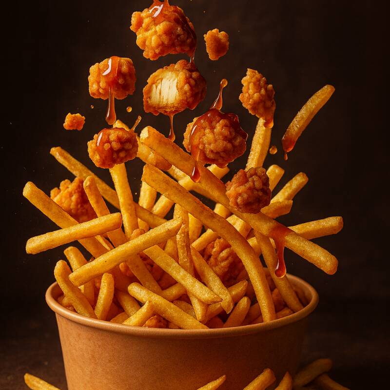 Cama de papas doraditas con pechuga empanizada + aderezo especial, salsa a elegir y parmesano.
