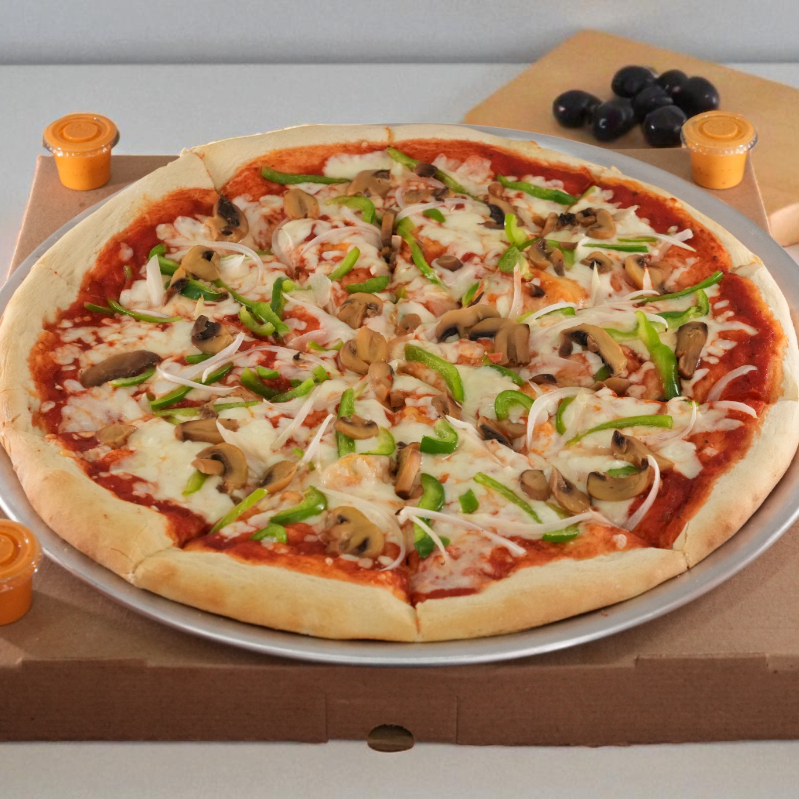 Pizza familiar de 10 rebanadas con vegetales frescos como; aceitunas, pimiento, y champiñones.