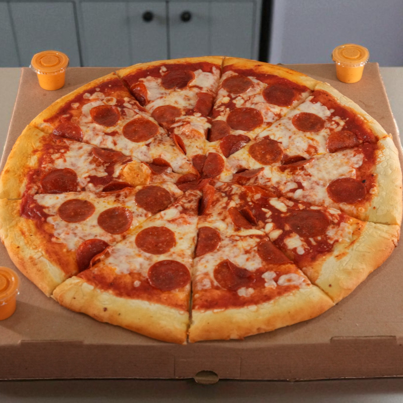 Pizza familiar de 10 rebanadas con pepperoni y extra queso.