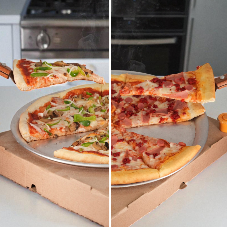 Pizza familiar de 10 rebanadas, mitad carnes frías y mitad vegetariana.