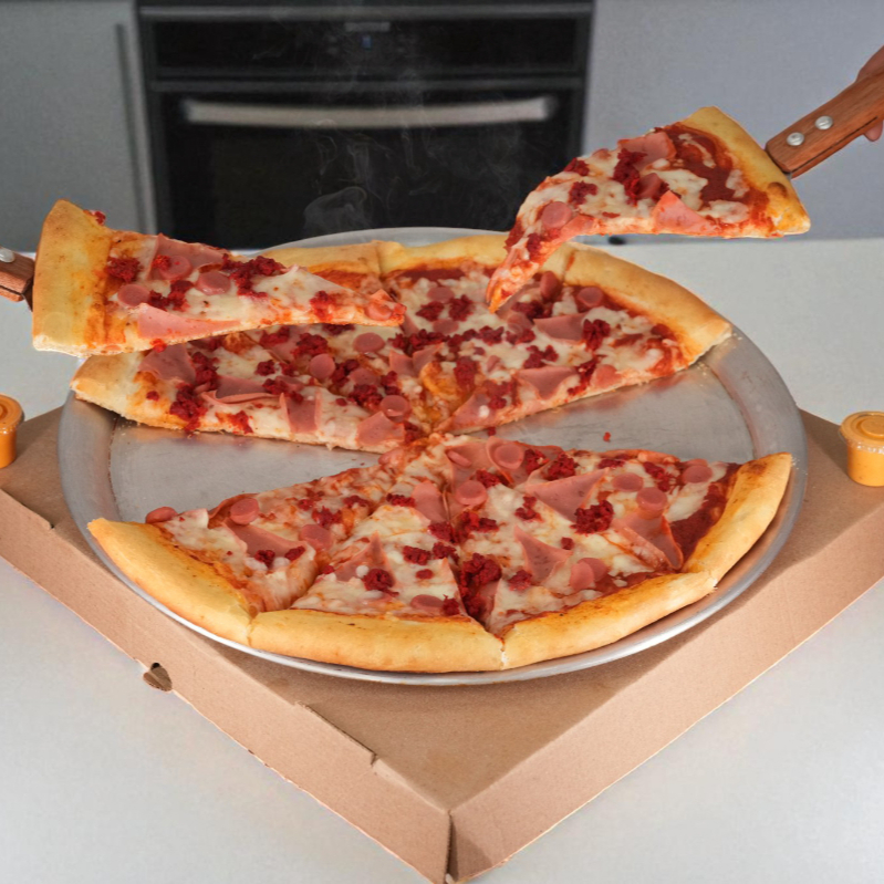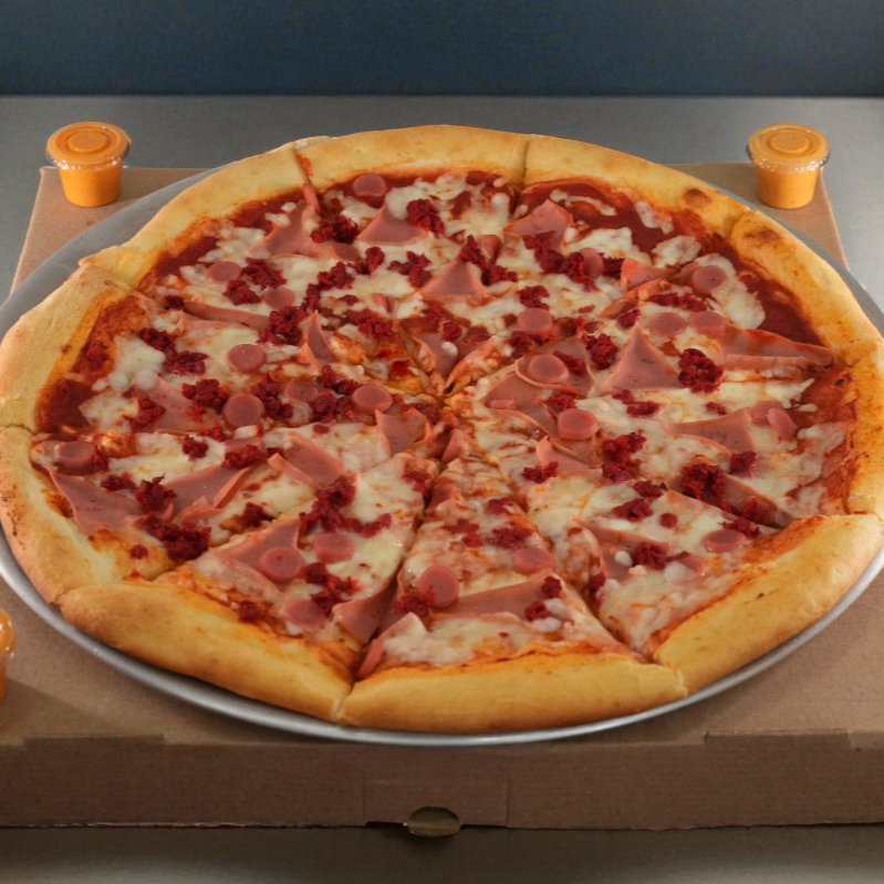 Pizza familiar de 10 rebanadas con variedad de carnes frías, queso y salsa de la casa.