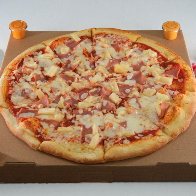 Pizza familiar de 10 rebanadas con jamón, piña y queso
