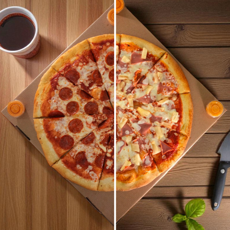 Pizza familiar de 10 rebanadas, mitad de pepperoni y mitad hawaiana.