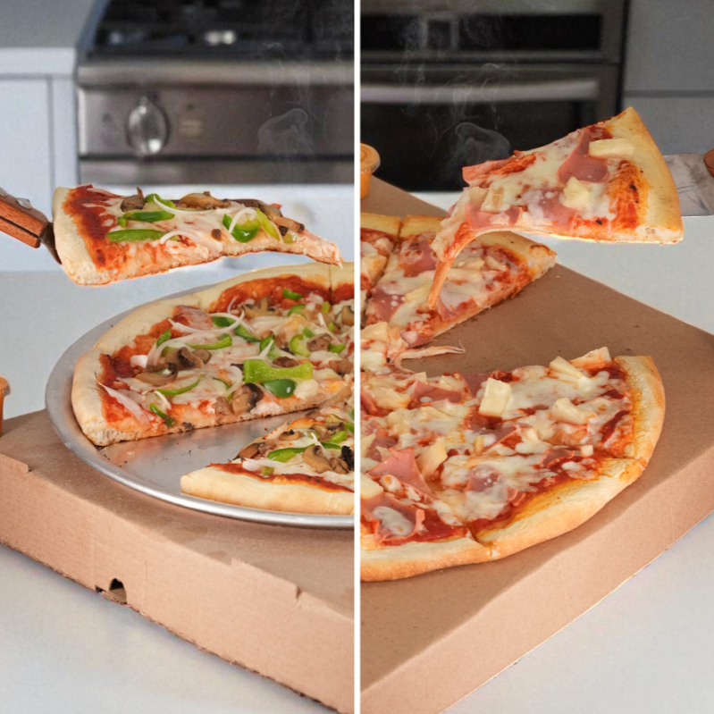 Pizza familiar de 10 rebanadas mitad hawaiana y mitad vegetariana.