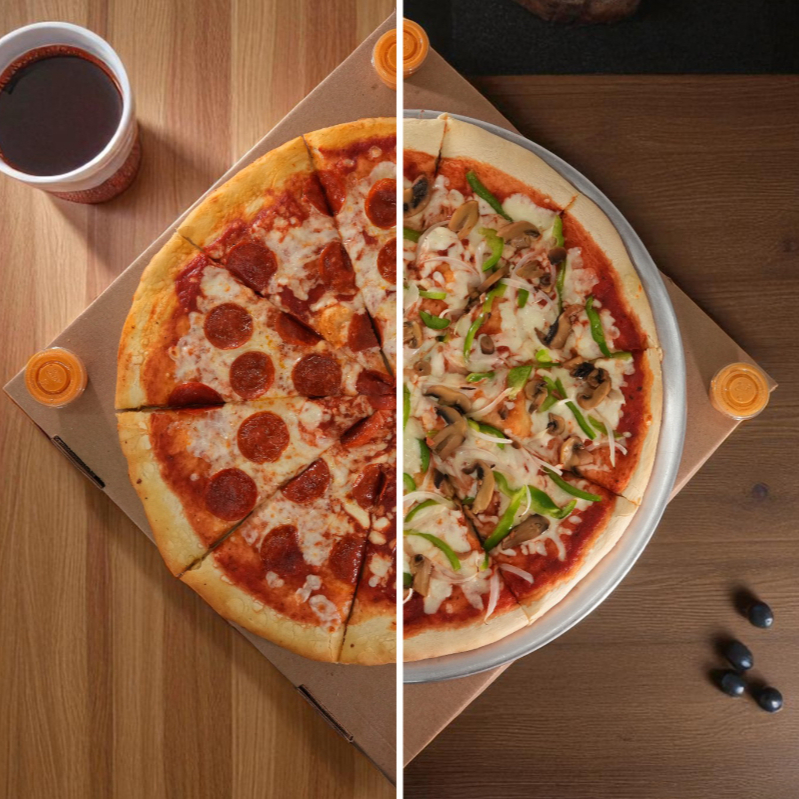 Pizza familiar de 10 rebanadas, mitad pepperoni y mitad vegetariana.