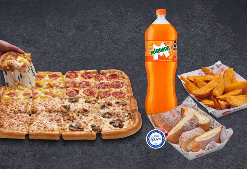 4 deliciosas combinaciones en 16 rebanadas (Meat Lover´s, Mexicana, Hawaiana/rajas y Vegetariana)